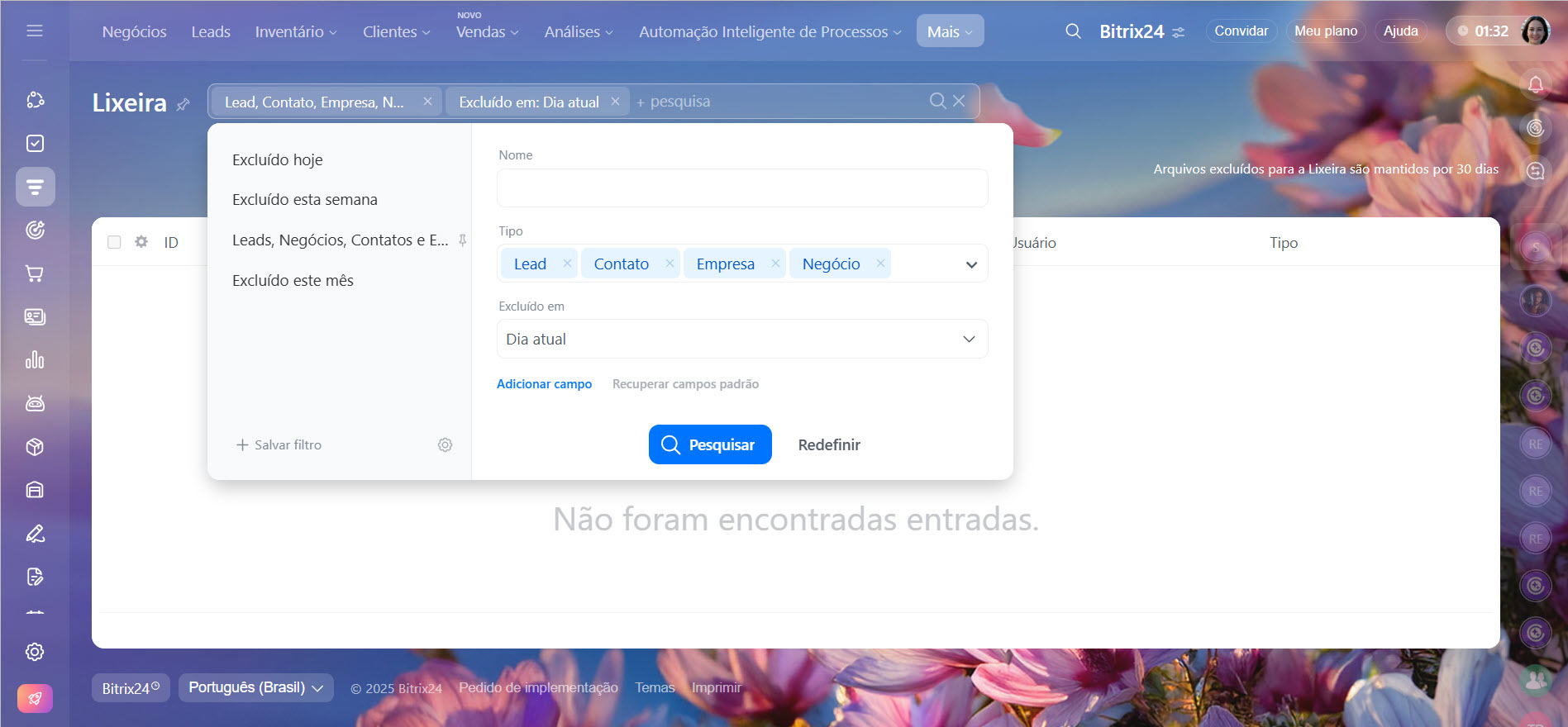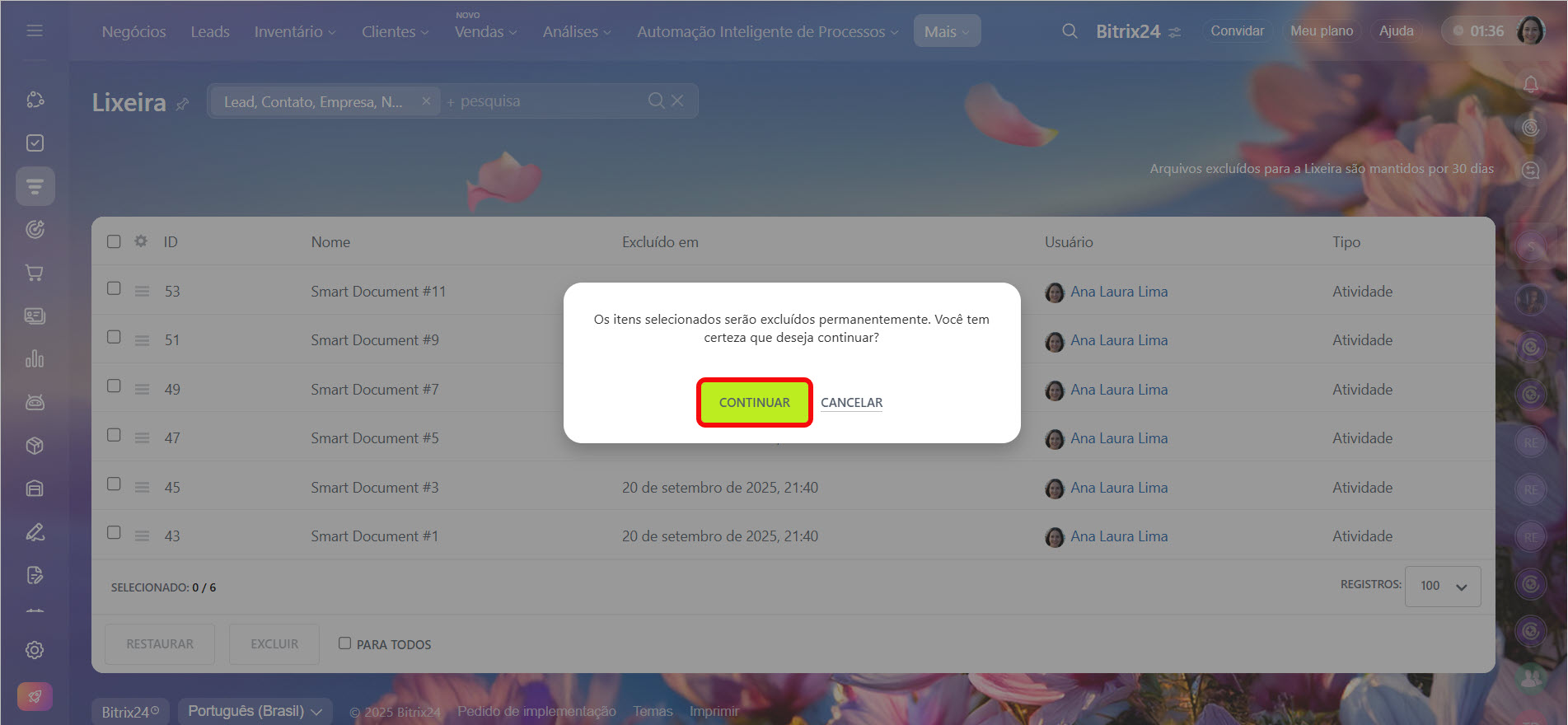 - Os itens na lixeira podem ser restaurados ou excluídos definitivamente. Apenas o administrador do Bitrix24 pode excluí-los.