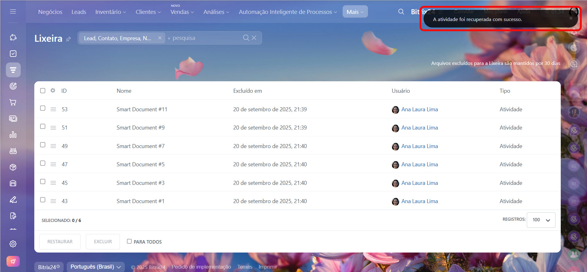 Quando o item do CRM for restaurado, você verá uma notificação sobre isso.
