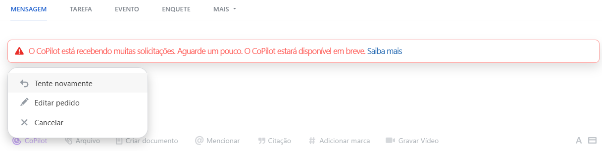 Quando você envia uma solicitação, o CoPilot verifica o número de solicitações realizadas na última hora. Caso o limite de 600 solicitações tenha sido atingido nesse período, novas solicitações não serão processadas.