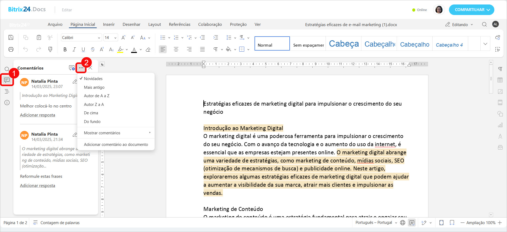 Você pode visualizar as alterações, organizar os comentários ou adicionar novos. Clique em Comentários > Três pontos (...) e escolha a opção desejada.