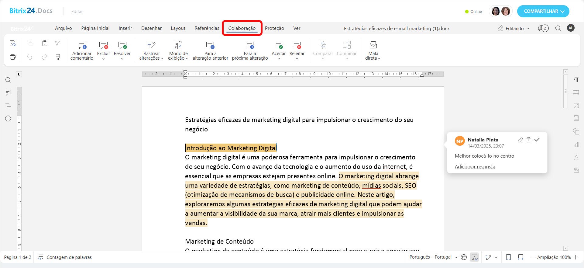 Para alternar rapidamente entre comentários e revisões, rejeitá-los ou aceitá-los, use a aba Colaboração.