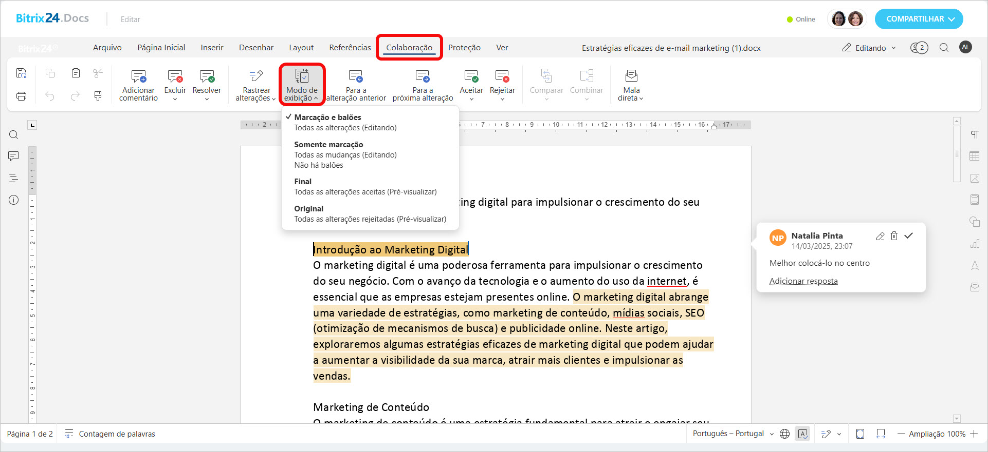 Visualização de correções. Na aba Colaboração > Modo de exibição, você pode escolher como as revisões serão exibidas no texto.
