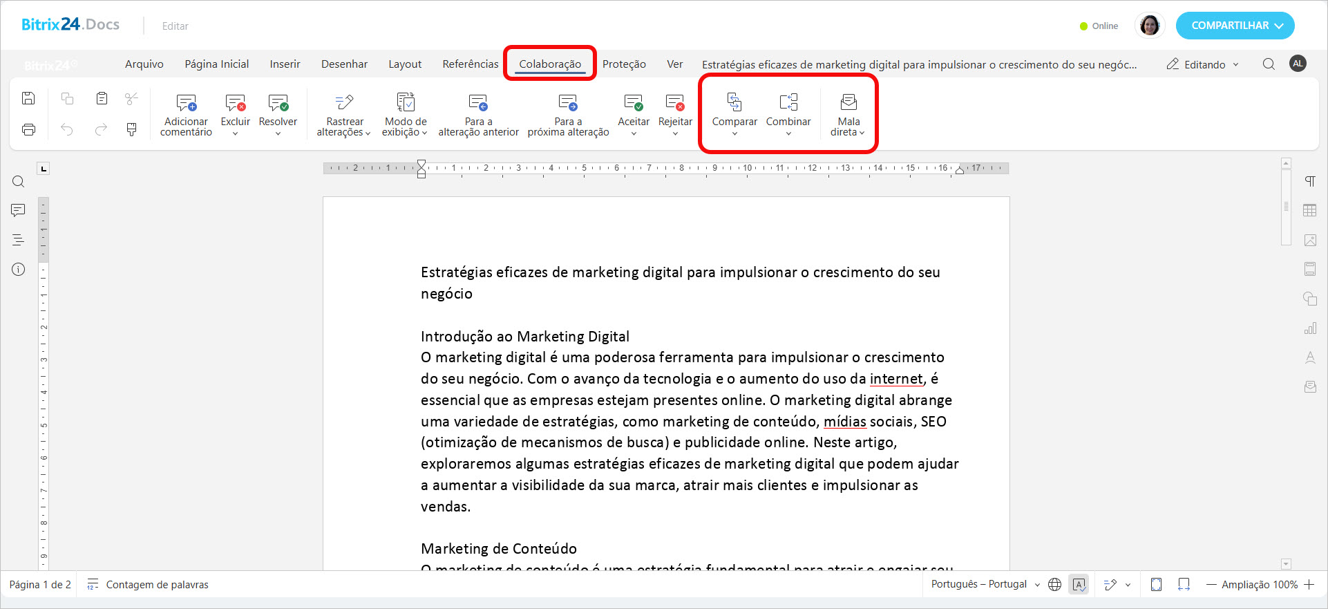 - Mala direta — ajuda a unir alterações se vários colaboradores editaram o documento simultaneamente. É possível aceitar ou rejeitar cada correção.