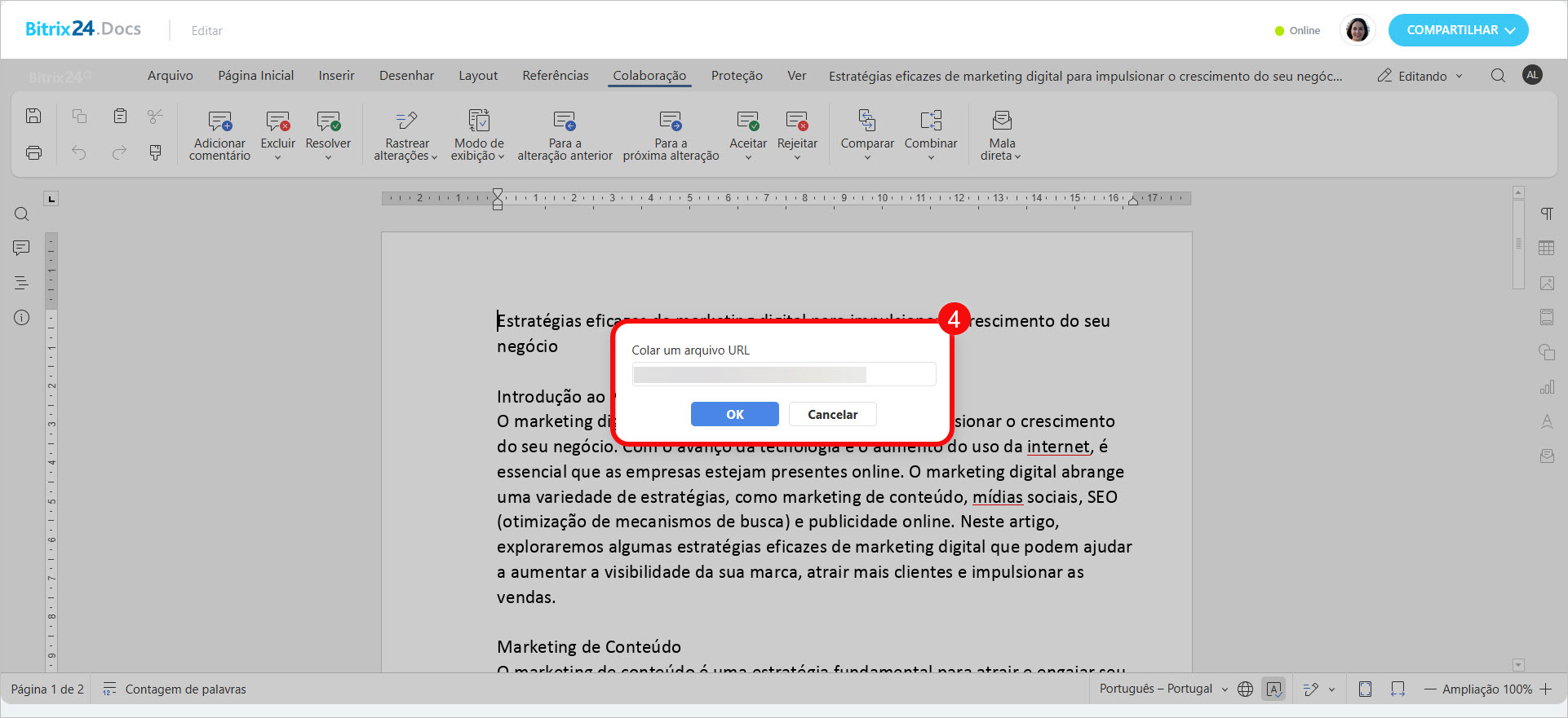 - No Bitrix24.Docs, os colaboradores têm a flexibilidade de trabalhar em diferentes modos: edição, revisão, visualização e comentários.