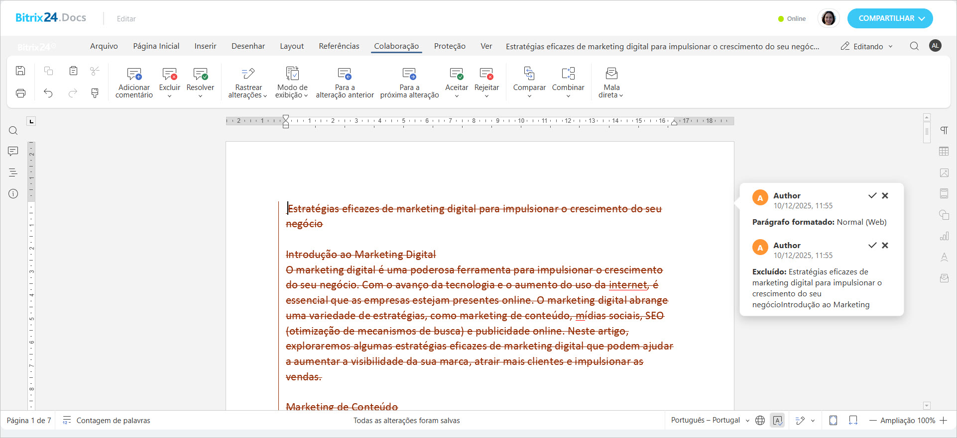 - Original — mostra a versão inicial do documento para comparar com a atual e avaliar o volume de alterações.