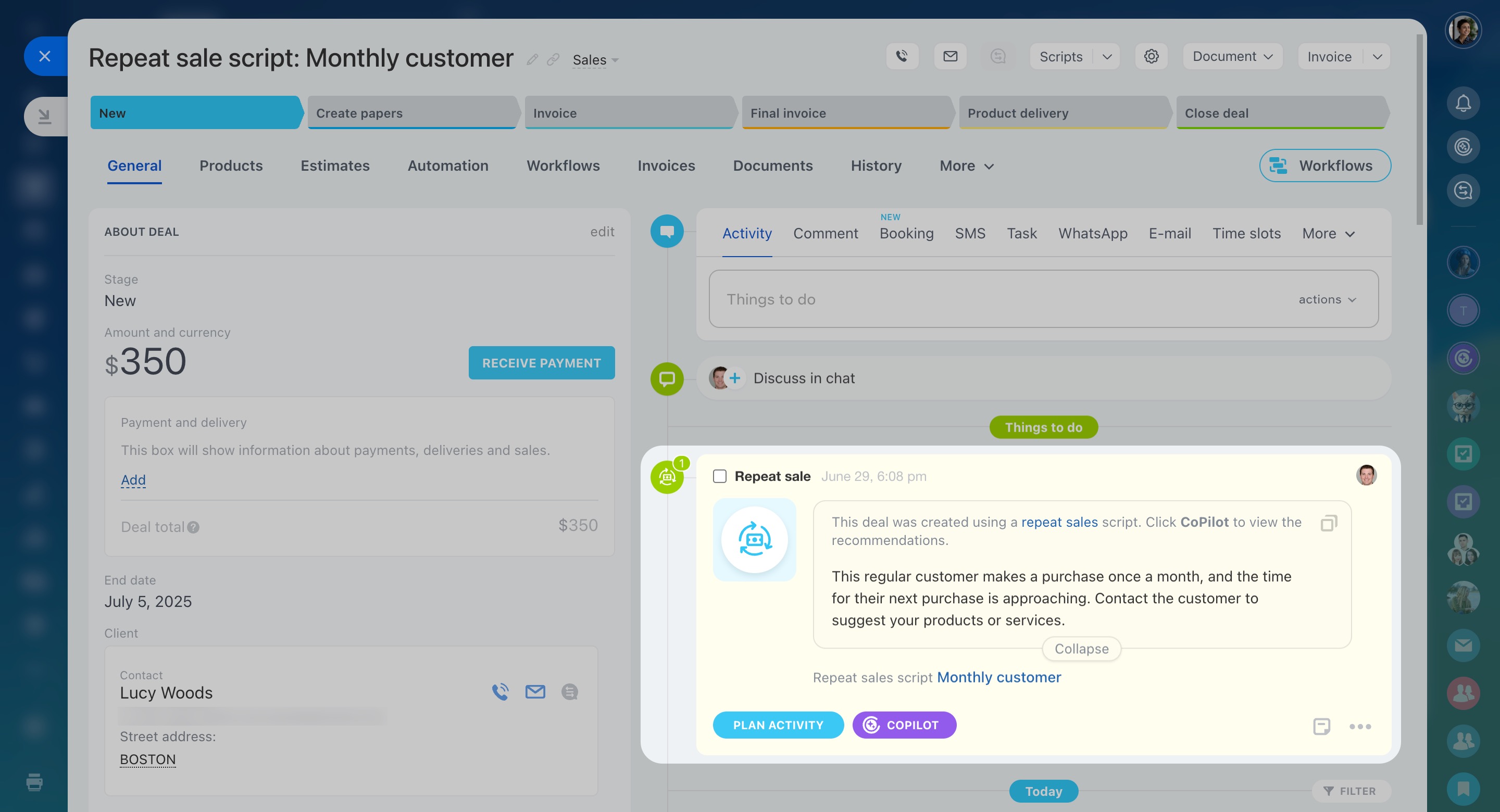 Vendas recorrentes são aquelas realizadas para clientes que já compraram de você anteriormente. As Vendas recorrentes com IA identificam, no CRM, clientes prontos para novas compras e criam automaticamente negócios para eles. Em cada negócio, o CoPilot adiciona uma atividade com recomendações personalizadas para o gerente — o que oferecer ao cliente e como conduzir a conversa.