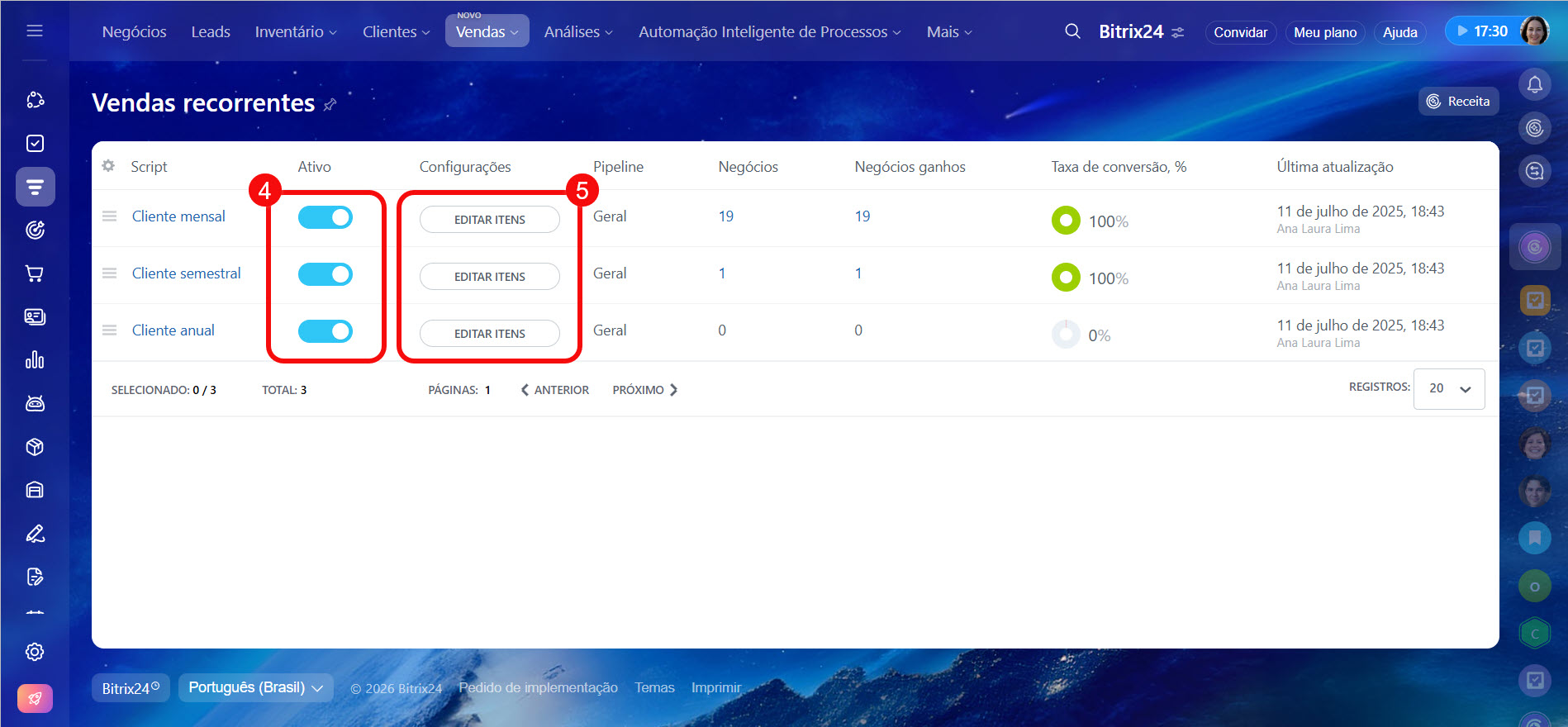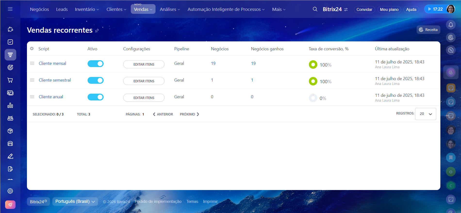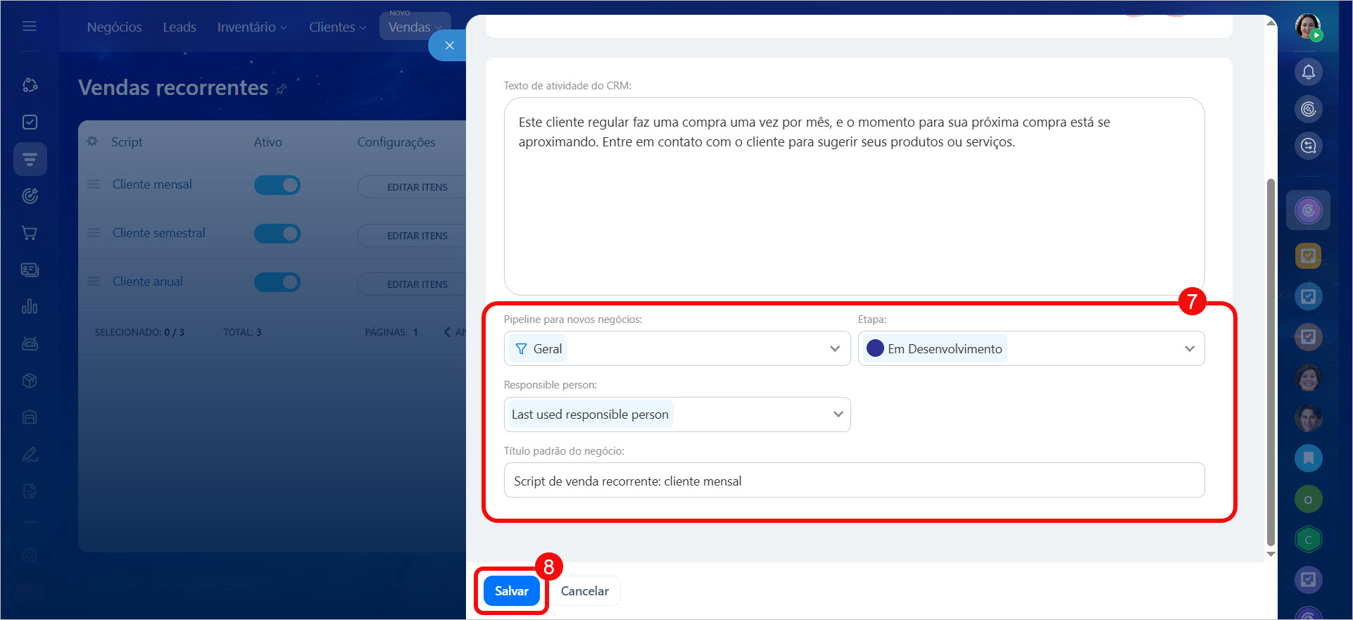 - Acesse CRM > Vendas > Vendas recorrentes e escolha os cenários para criação automática de negócios recorrentes: compras mensais, semestrais ou anuais.
