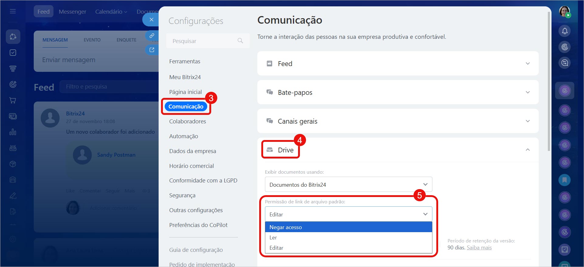 Se for importante controlar o acesso a documentos confidenciais, configure o nível de acesso padrão que é concedido através de um link interno. Isso pode ser feito pelo administrador do Bitrix24.