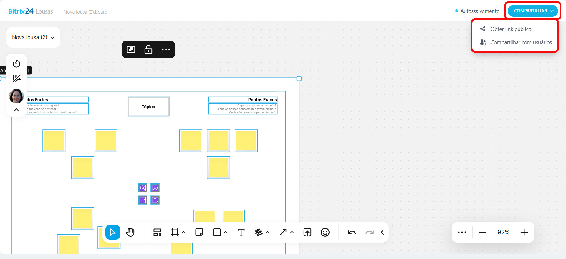 No editor de documentos ou lousas. Se você já estiver trabalhando em um documento ou lousa, clique em Compartilhar e selecione uma opção: