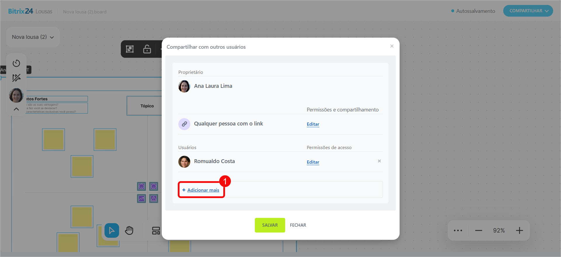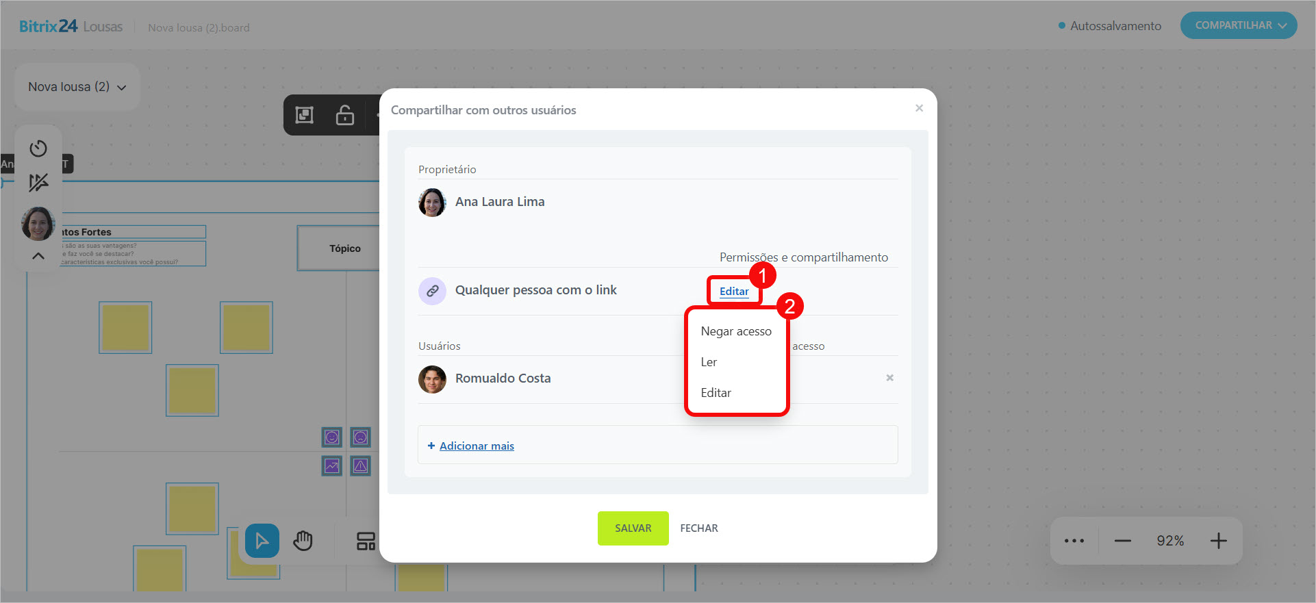- Acesso total: o colaborador pode realizar todas as ações anteriores, além de configurar o acesso para outros participantes.