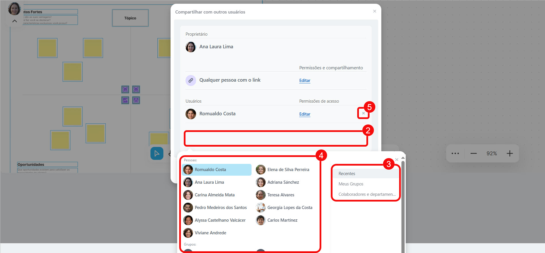 O acesso a documentos e lousas pode ser configurado a partir da lista de itens ou diretamente durante o trabalho neles.