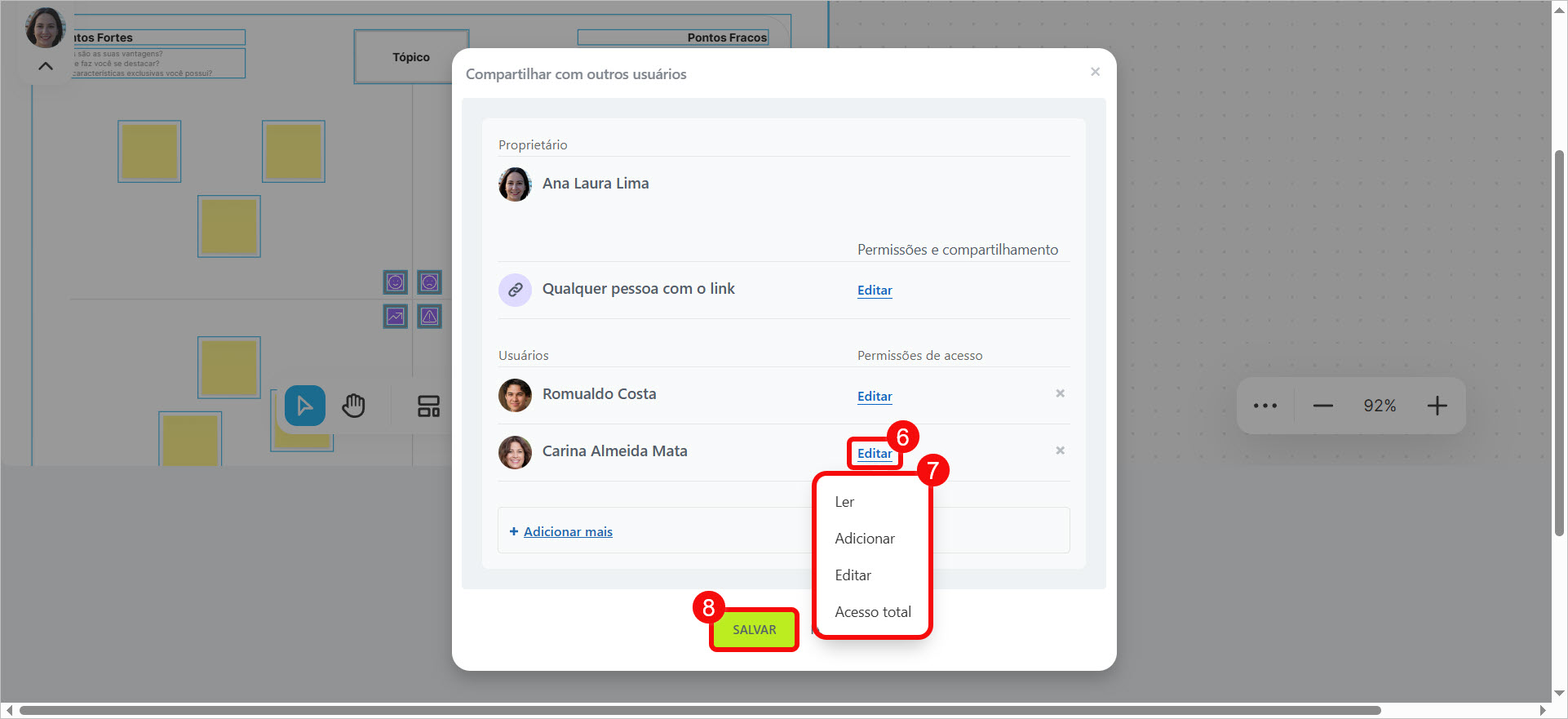 - Editar: o colaborador pode visualizar e editar a lousa, ou seja, alterar seu nome e design, adicionar, remover ou modificar elementos e conexões entre eles.