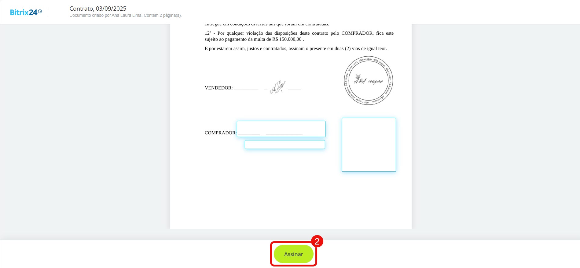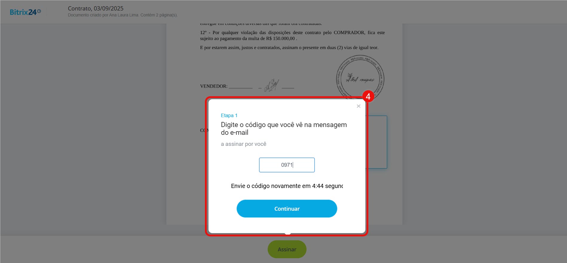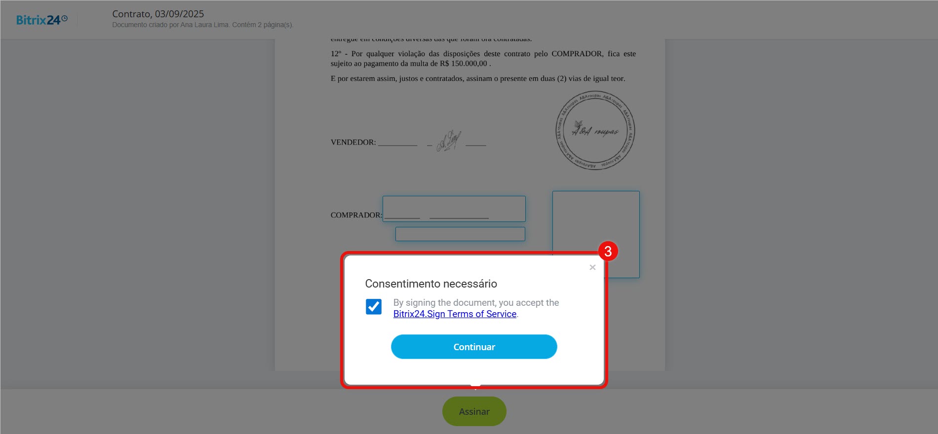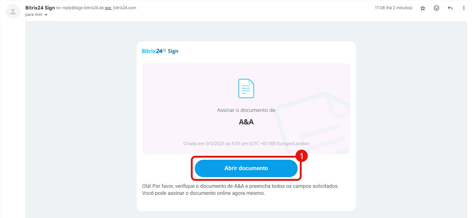 Assinar um documento com a Assinatura Eletrônica do Bitrix24 - Em seguida, o cliente recebe o documento para assinatura.