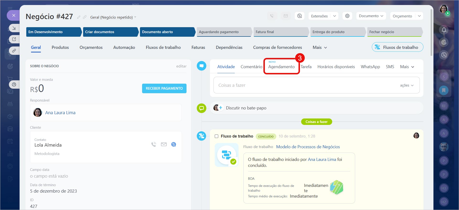 No cartão do CRM. Acesse a seção CRM e selecione o elemento desejado, como um contato ou negócio. Na linha do tempo, clique em Agendamento online e escolha o horário para o recurso necessário.