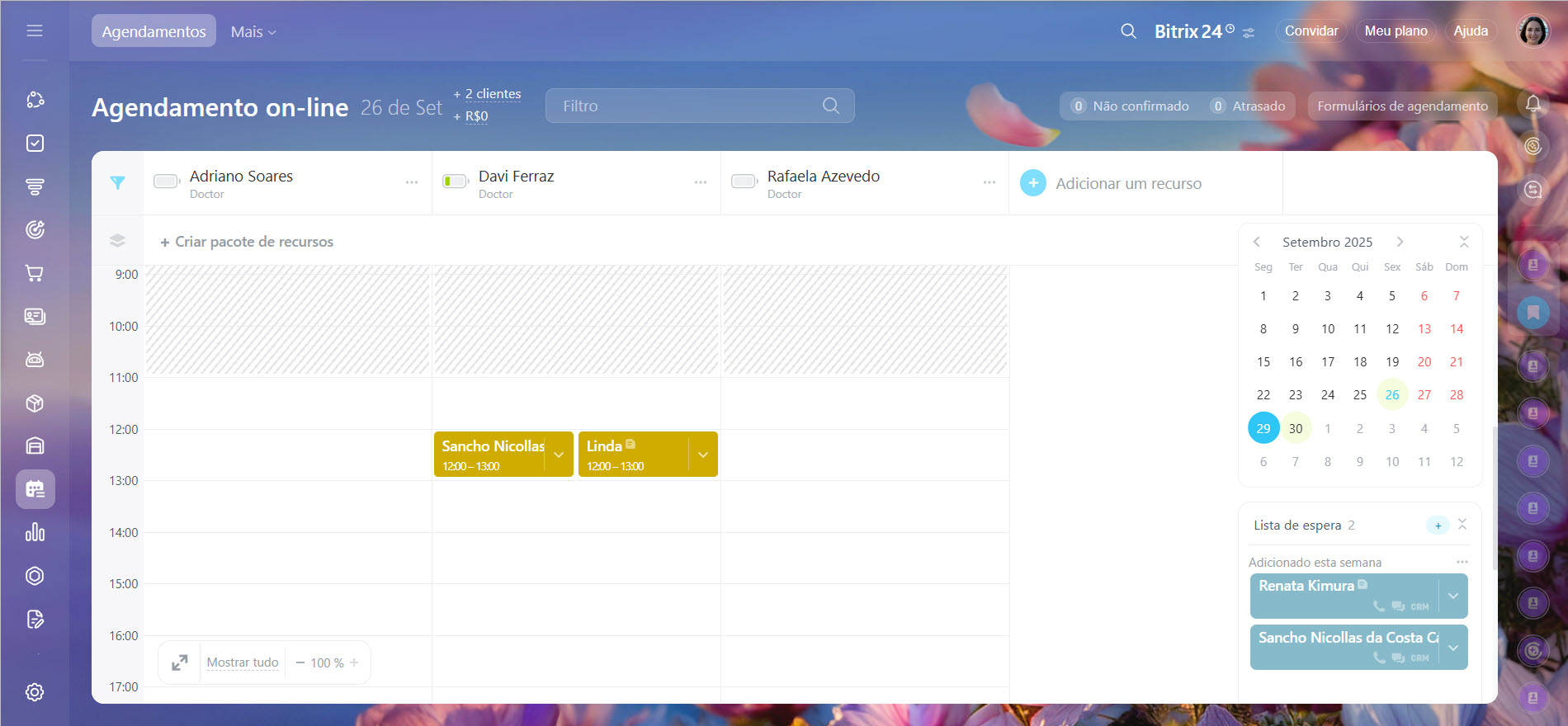 Recursos são todos os elementos necessários para a prestação de um serviço: especialistas, espaços, equipamentos, entre outros. Para cada recurso, é possível definir o tipo, o horário de funcionamento e a duração do agendamento. Por exemplo, um recurso pode ser: