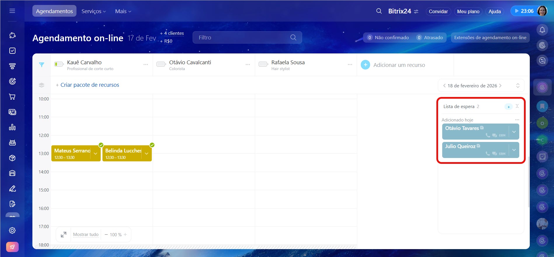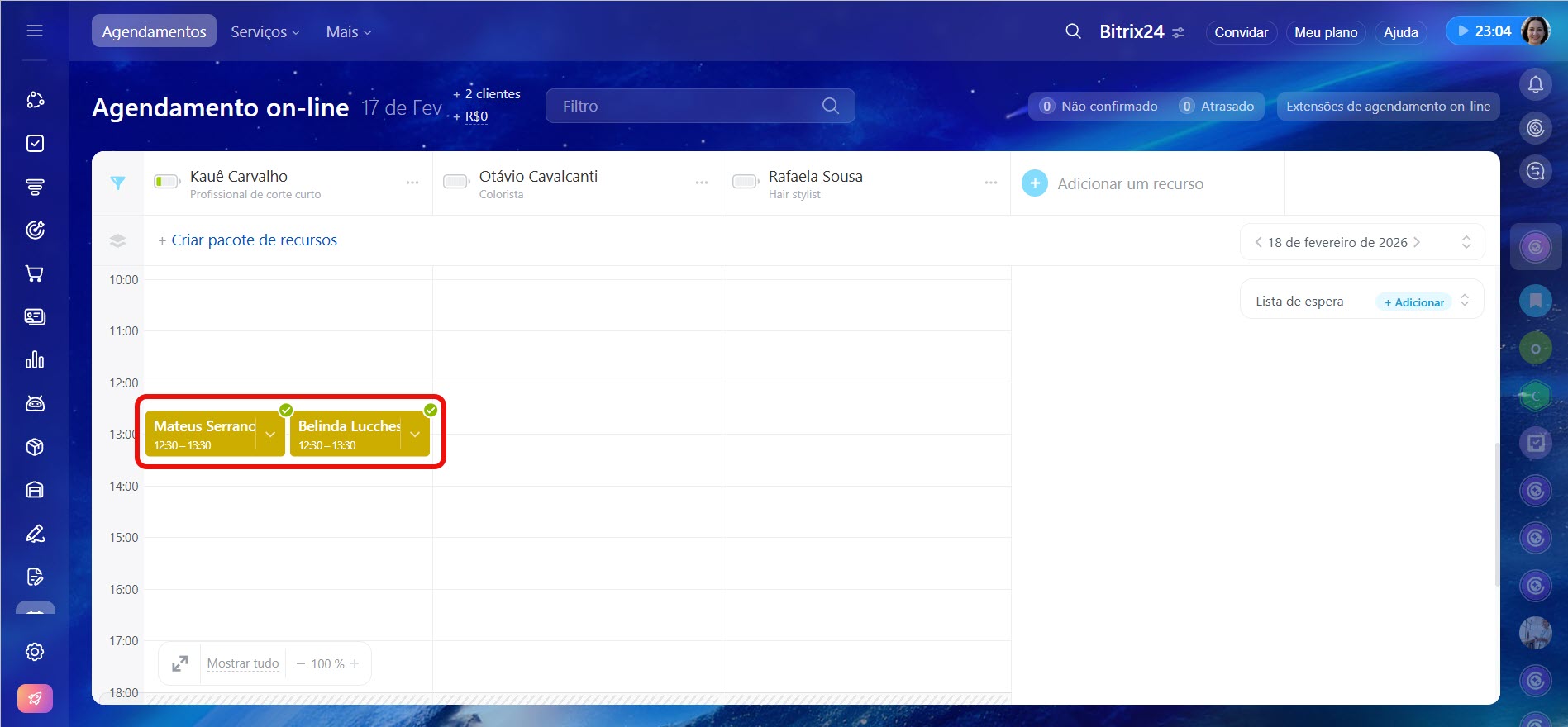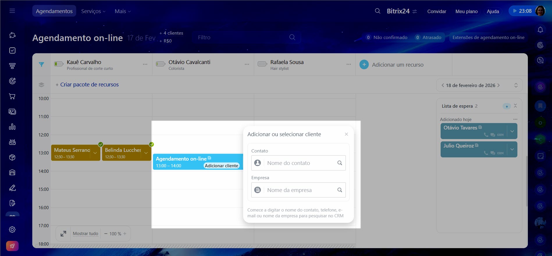 Quando todos os horários estão ocupados, é possível adicionar o cliente a uma lista de espera. Caso haja um cancelamento, o atendente pode oferecer o horário disponível para quem já deixou uma solicitação e está aguardando. Isso evita períodos ociosos na agenda e ajuda a reter clientes.