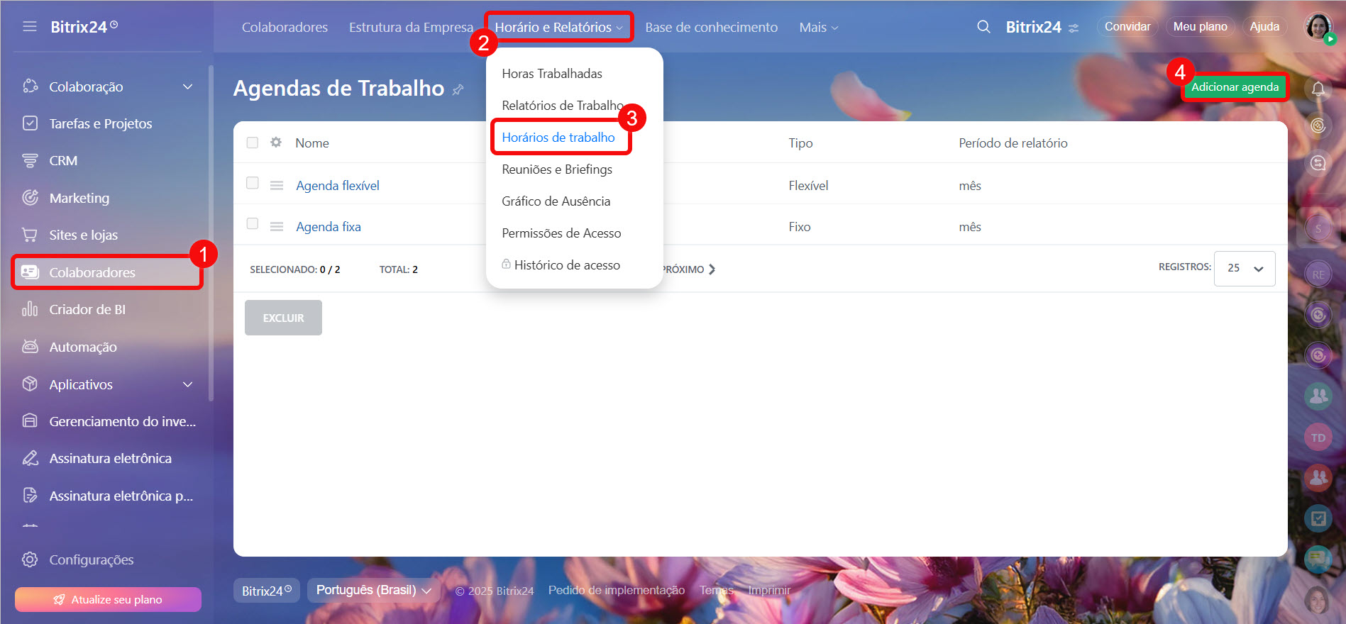 - Crie horários fixos, flexíveis ou baseados em turnos no Bitrix24.