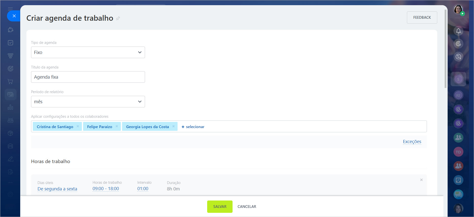 - Defina horários de trabalho, dias úteis e intervalos de acordo com as necessidades da sua empresa.