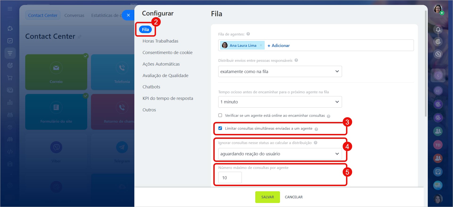 Se um agente tiver mais de mil diálogos não encerrados, novas solicitações serão atribuídas a outros colaboradores na fila do canal aberto.