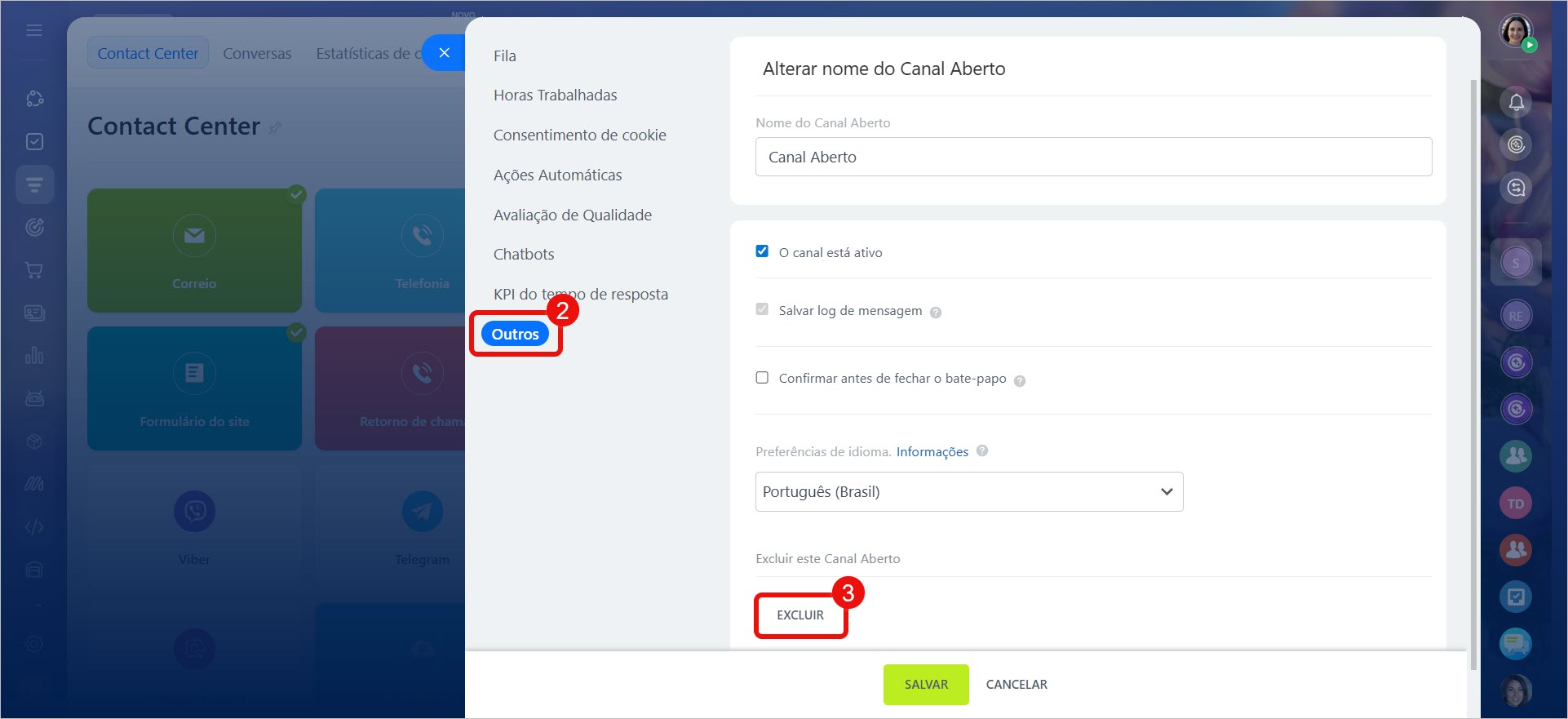 Se um canal aberto não for mais necessário ou tiver sido criado por engano, ele pode ser excluído.