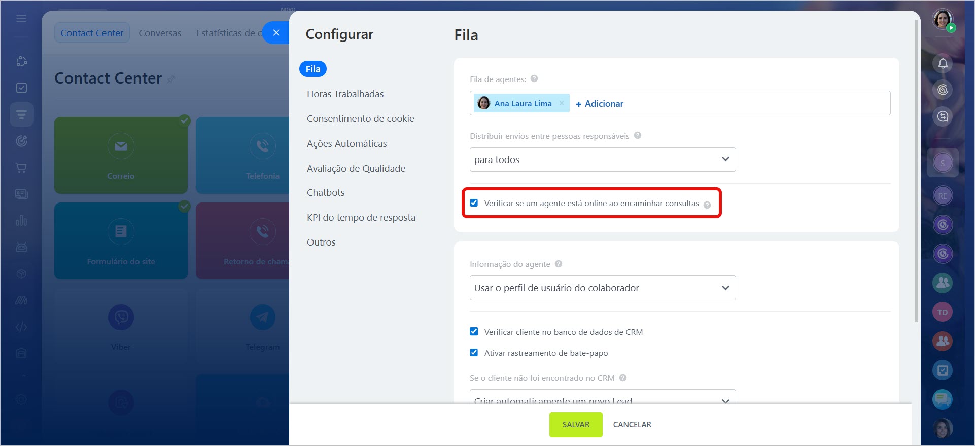 Ative a opção Verificar se um agente está online ao encaminhar consultas nas configurações do canal aberto. Assim, novos diálogos não serão atribuídos a colaboradores que estão offline ou ausentes, como em horário de almoço ou férias.