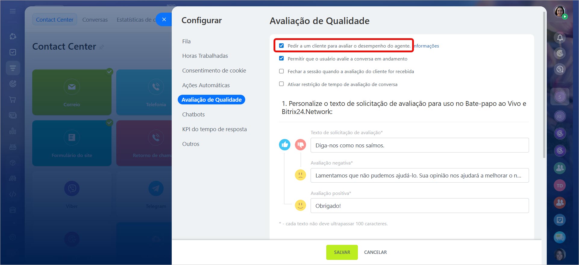 Para permitir que os clientes avaliem o atendimento, acesse a aba Avaliação de qualidade nas configurações do canal aberto e ative a opção Pedir a um cliente para avaliar o desempenho do agente..