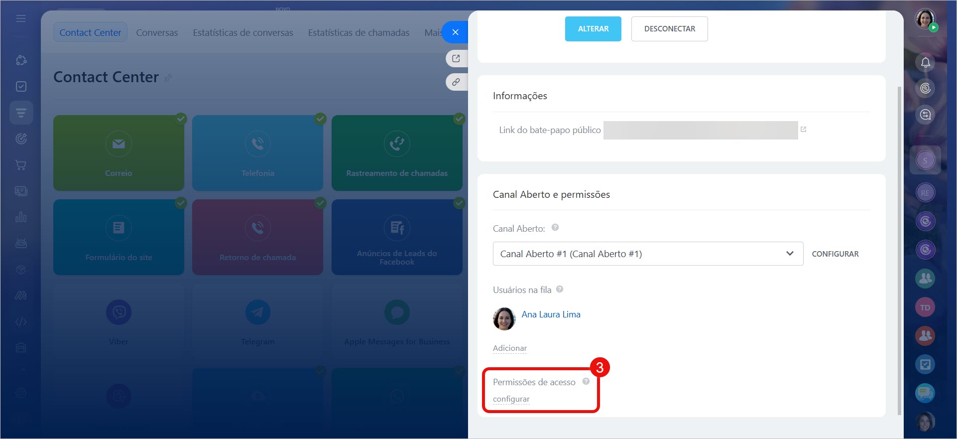 - como configurar permissões de acesso no Contact Center para diferentes colaboradores,