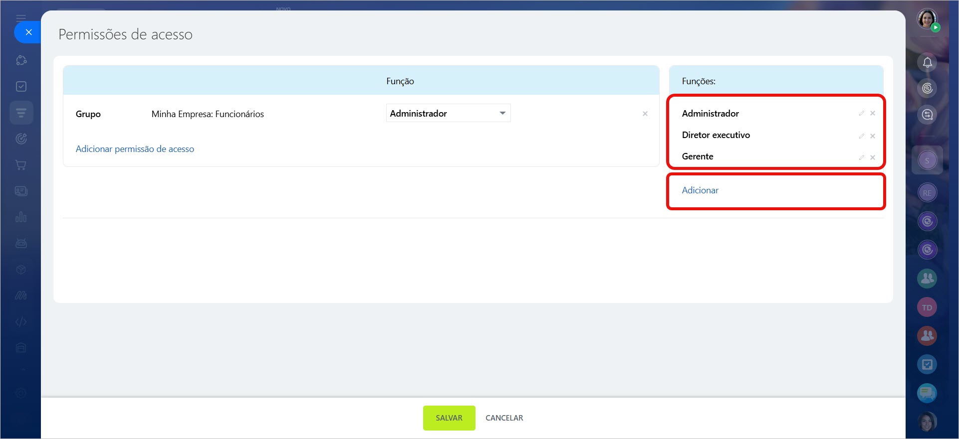 As permissões de acesso nos canais abertos são atribuídas por funções. Você pode definir quem terá acesso às configurações da seção Contact Center e quem apenas responderá aos clientes nos chats. Existem três funções predefinidas: