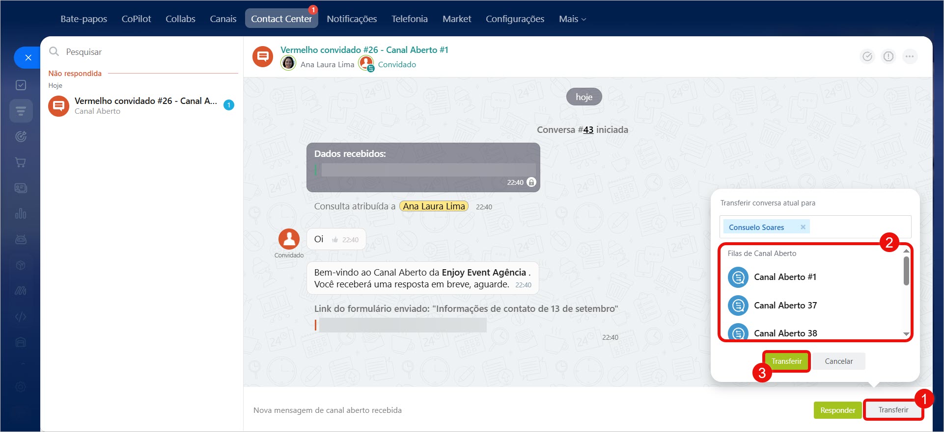 - Escolha na lista ou insira no campo de busca o nome do canal aberto ou do colaborador.
