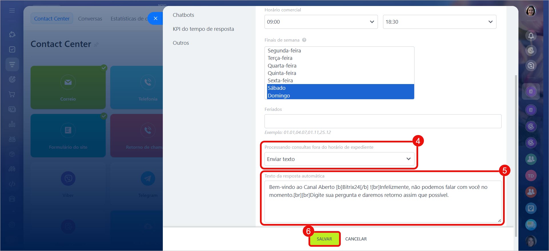 Configure uma resposta automática para mensagens recebidas fora do horário de atendimento. Os clientes poderão enviar mensagens, mas receberão uma notificação informando que a resposta será enviada no próximo horário de funcionamento.