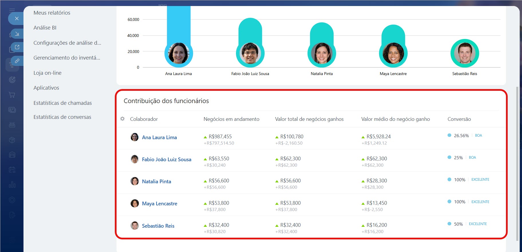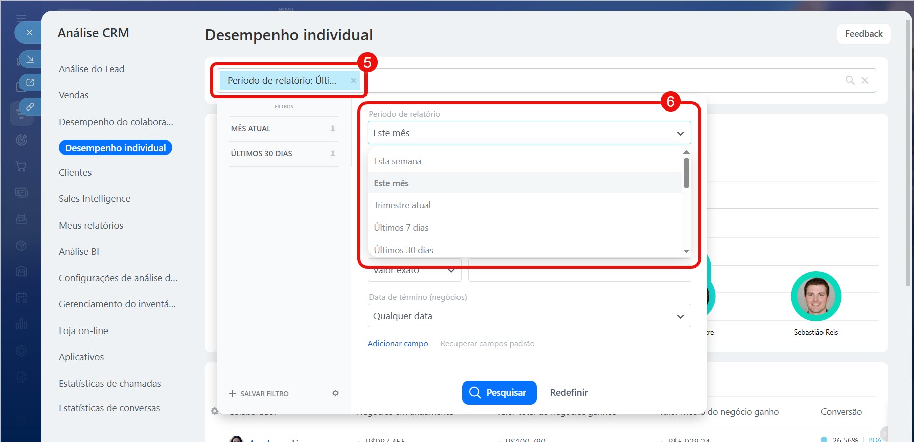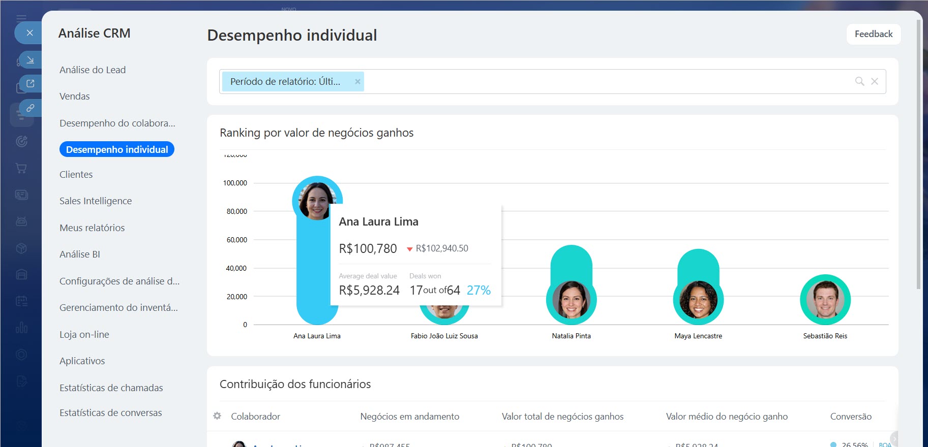 1-4. Acesse a seção CRM > Análises > Análises em tempo real > Desempenho do colaborador.