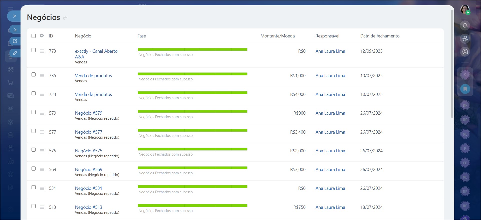 Ao clicar na seta verde ao lado dos valores nas colunas Negócios em andamento ou Valor total de negócios ganhos na tabela, você pode abrir uma nova aba com os negócios detalhados.