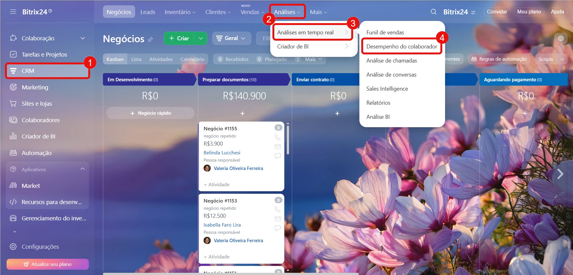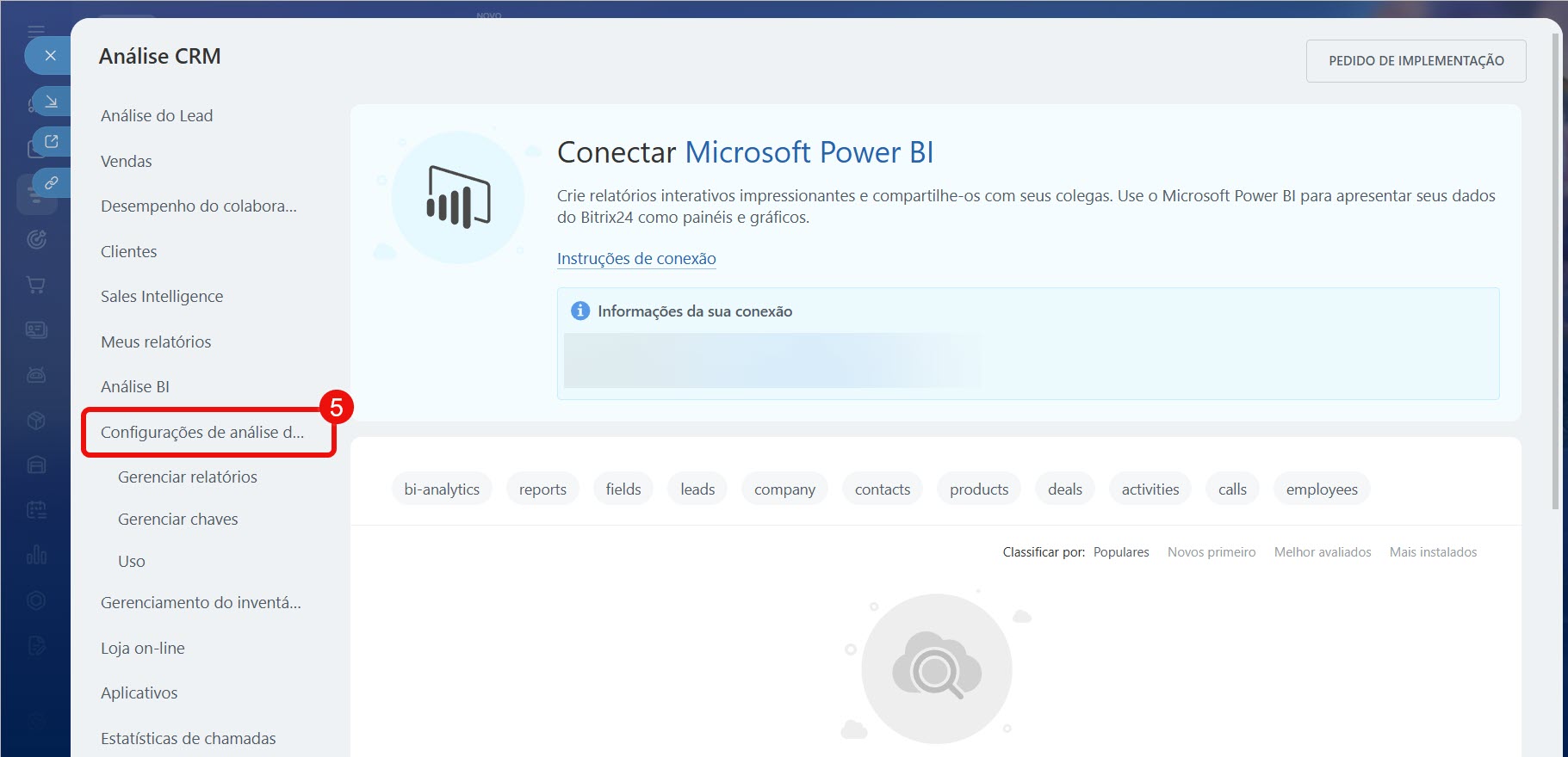 1-4. Para acessar as configurações, vá em CRM > Análises > Análises em tempo real > Análise BI.