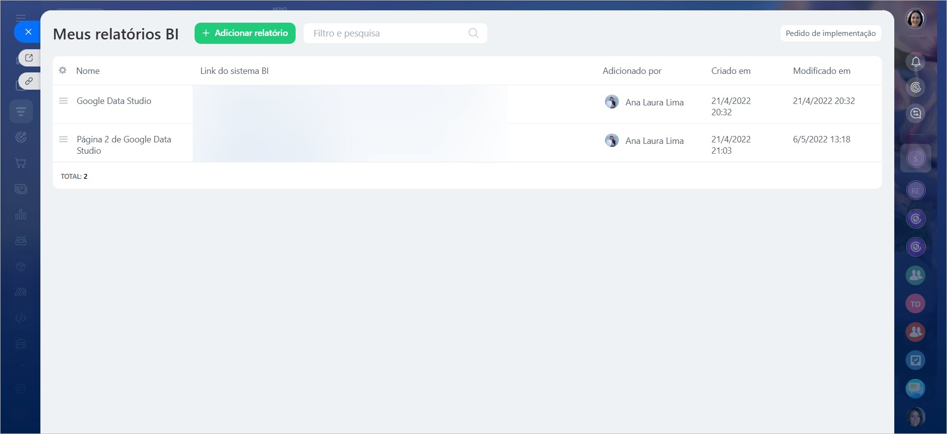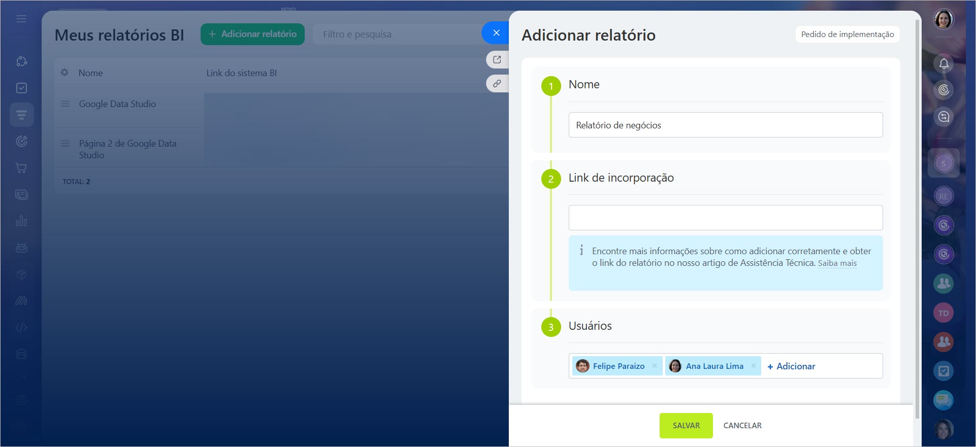 Em seguida, insira o nome, adicione o link e especifique os usuários que poderão visualizar o relatório na conta. Após salvar, o relatório aparecerá na lista e poderá ser acessado no seu Bitrix24.