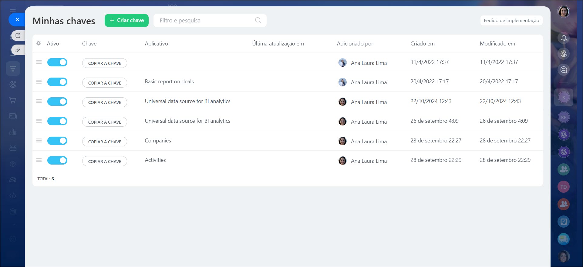 Nesta seção, você pode visualizar todas as chaves de aplicativos e definir permissões de acesso. Com as chaves, é possível exportar dados da sua conta para diferentes ferramentas de análise e fazer solicitações ao conector BI.