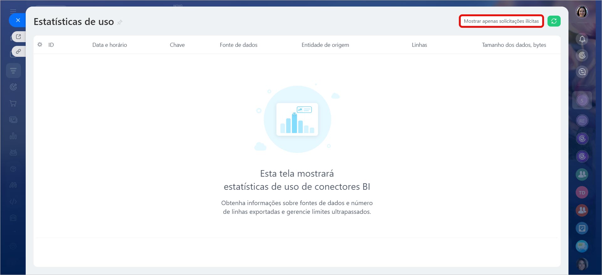 Para verificar se houve excedente de limite do conector BI, clique no botão Mostrar apenas solicitações ilícitas.