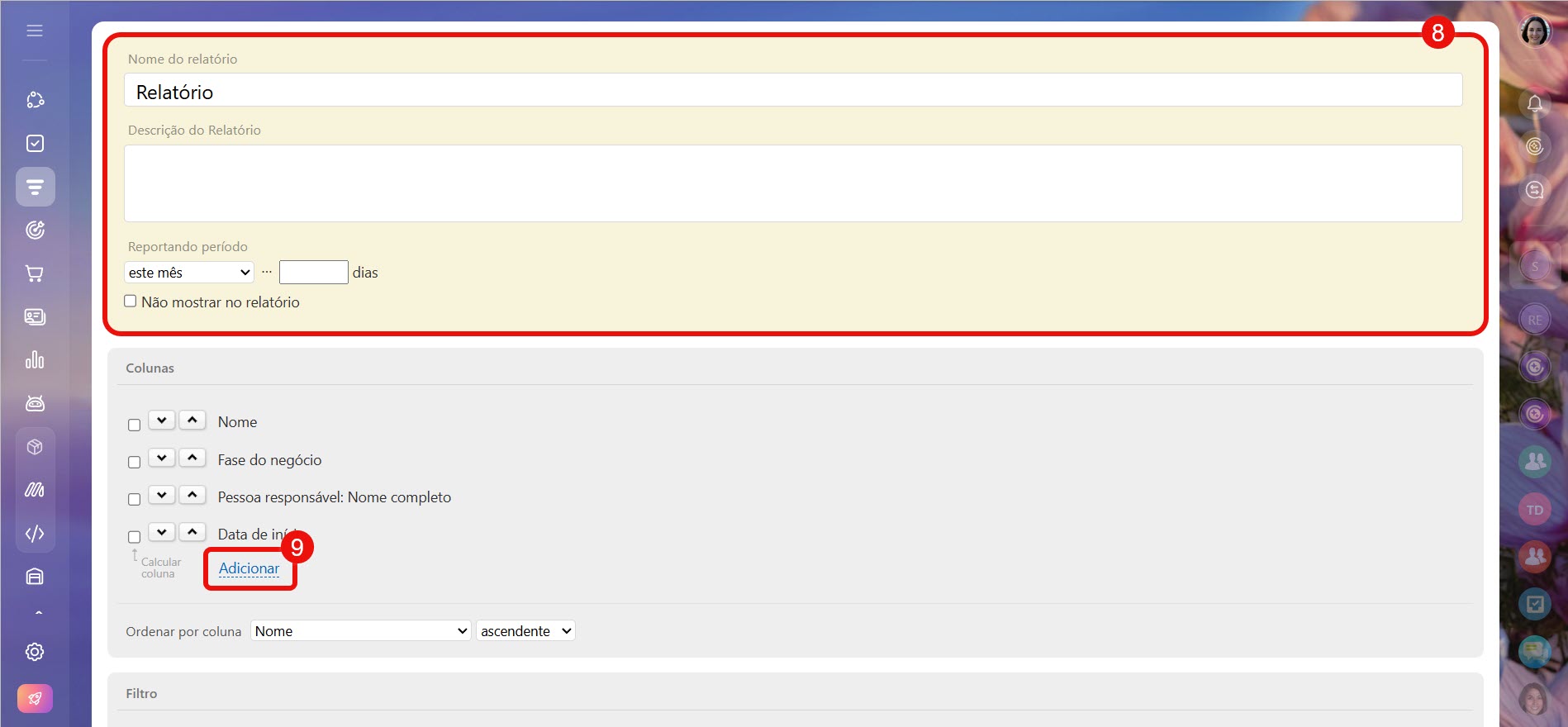 8-9. Na próxima tela, especifique um nome para o relatório, adicione uma descrição, defina os critérios e selecione as colunas para exibição.