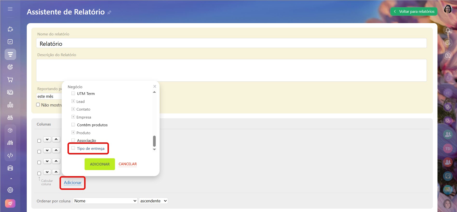 Atualmente, é possível adicionar apenas campos personalizados do tipo Texto e Lista às colunas do relatório CRM. Os campos personalizados disponíveis aparecem no final da lista de campos ao configurar as colunas.