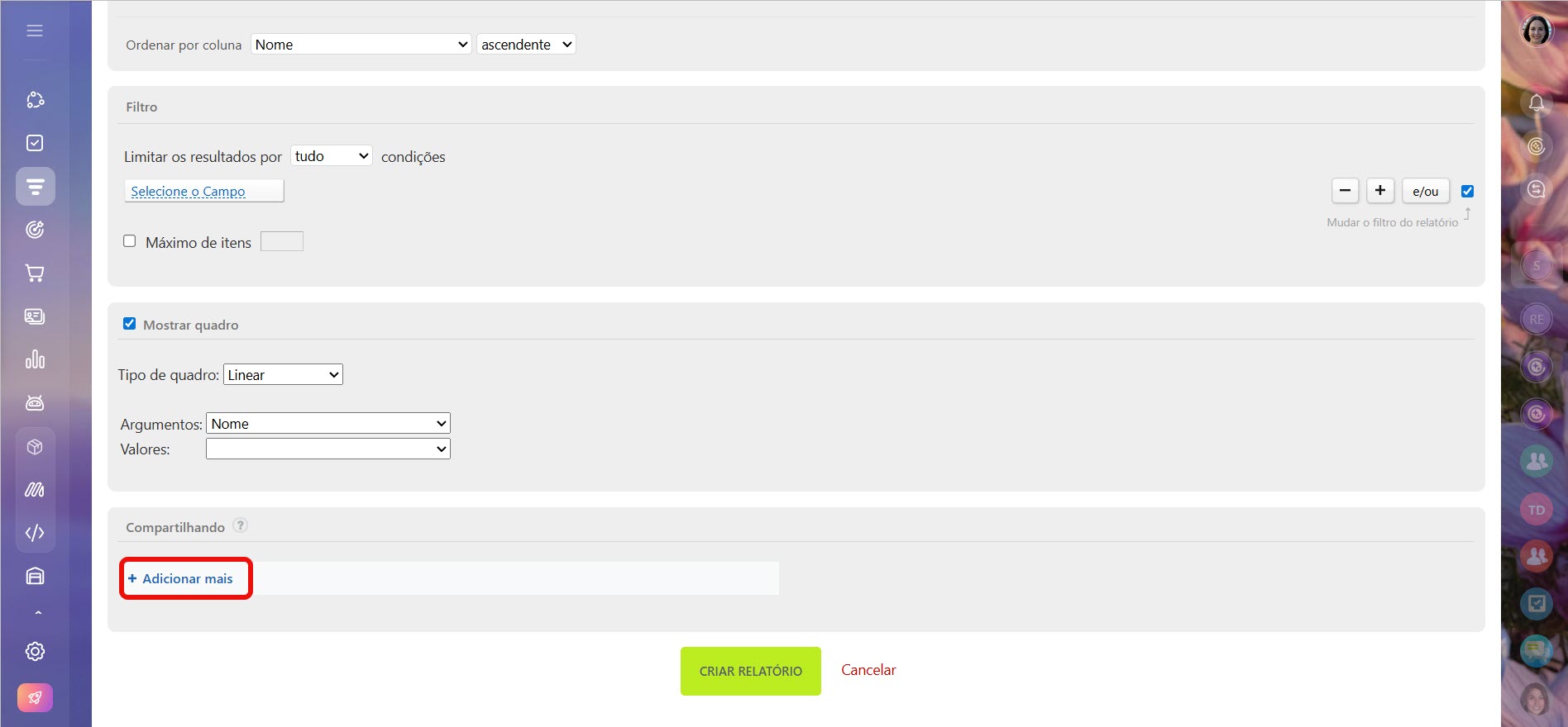 Para compartilhar o relatório com seus colegas, clique no botão Adicionar mais e selecione os usuários que terão acesso ao relatório.