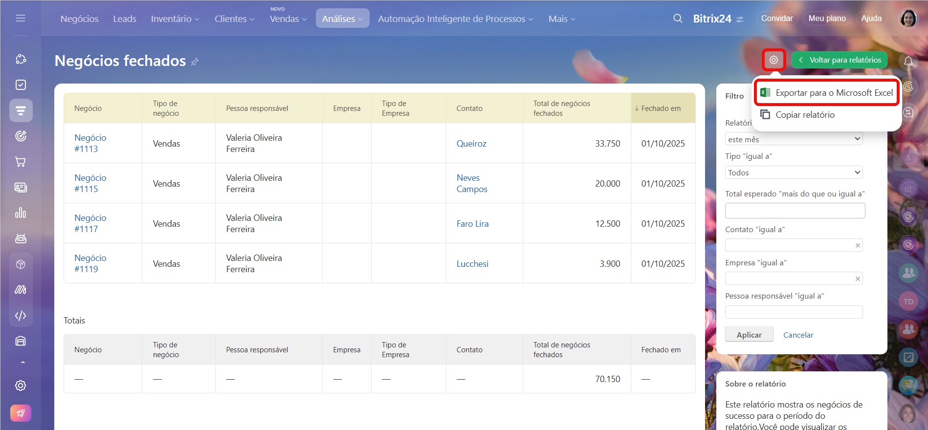 Para compartilhar os dados exatos do relatório, você pode exportá-lo para Excel e enviar o arquivo aos seus colegas.