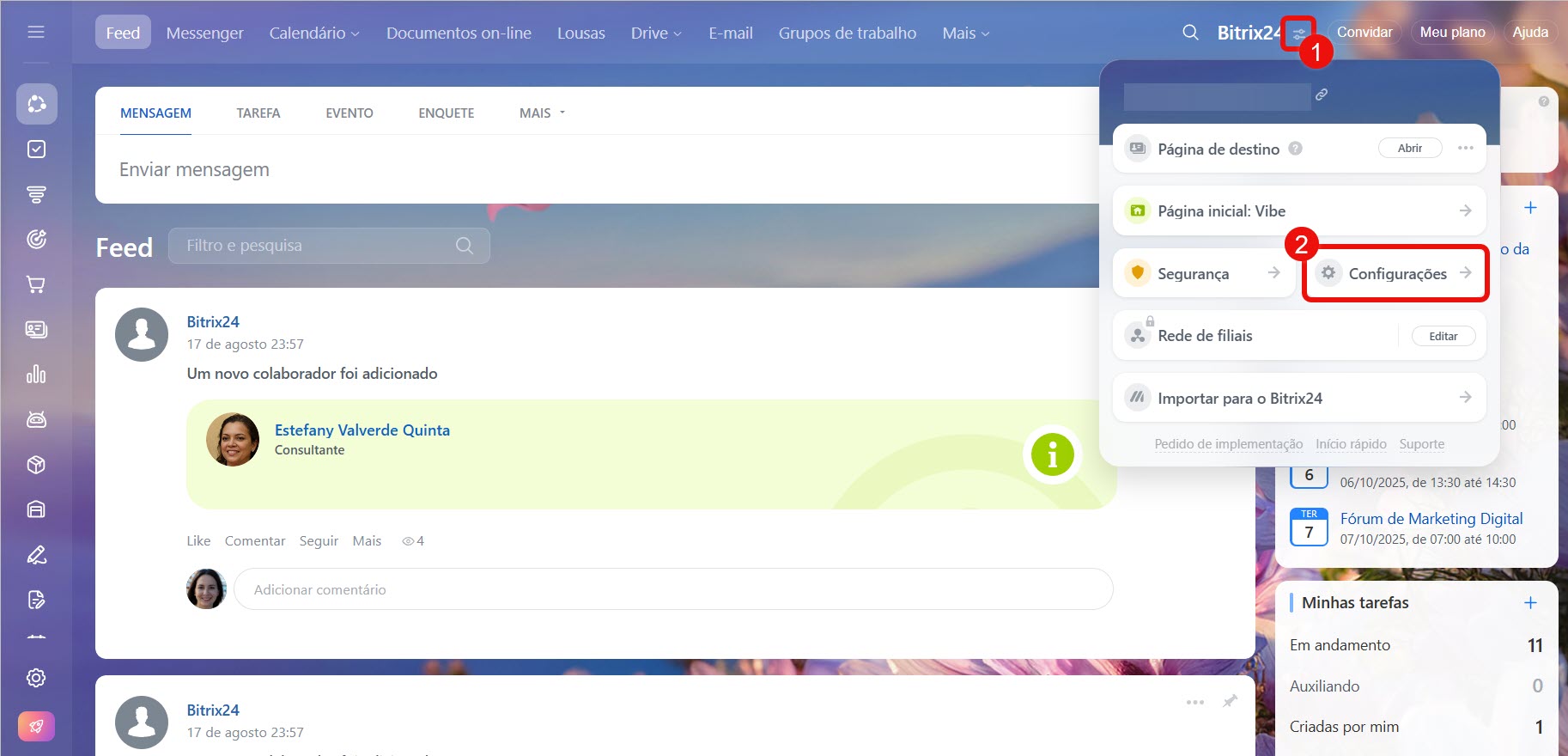 ao lado do nome Bitrix24. - Acesse Configurações (⚙️).