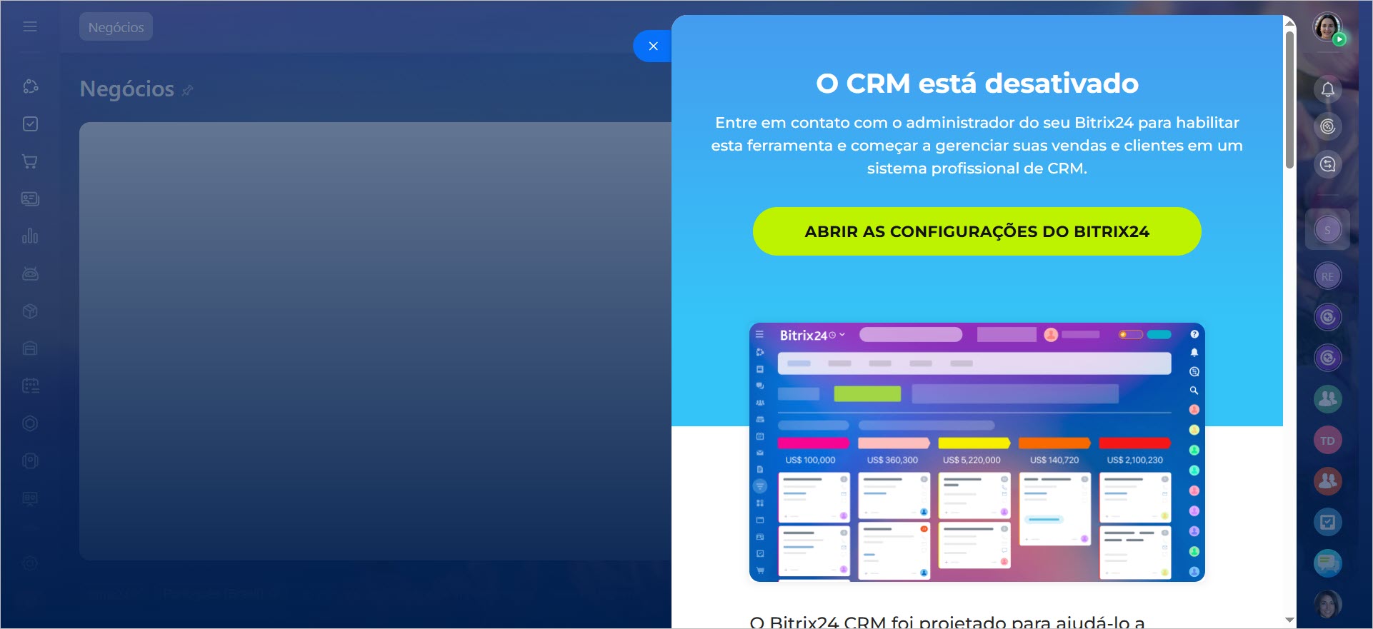 Por exemplo, se você desativar o CRM, ele será removido do menu principal. Caso alguém tente acessar o CRM diretamente pelo link, será exibida uma notificação informando que o CRM está desativado.