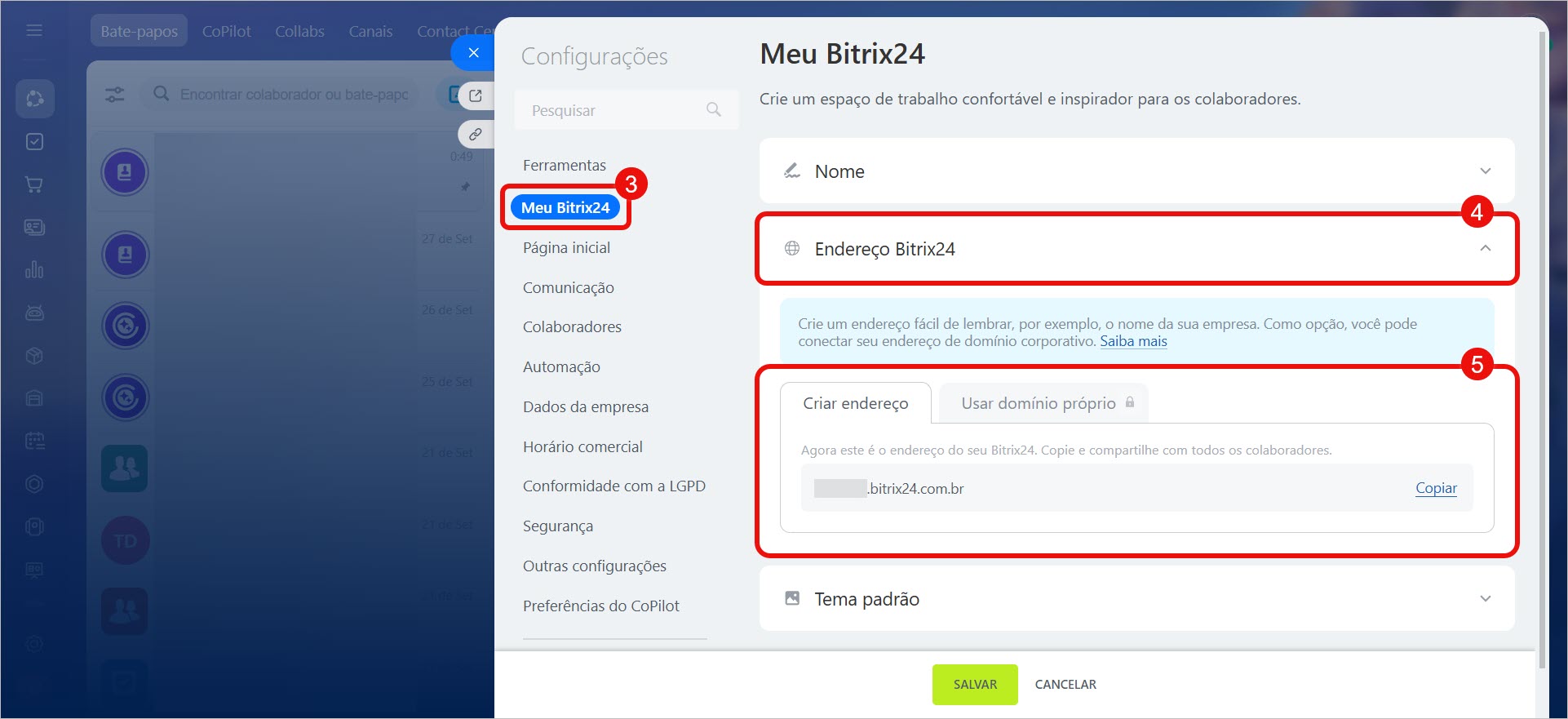 1–4. Acesse Configurações > Meu Bitrix24 > Endereço Bitrix24.