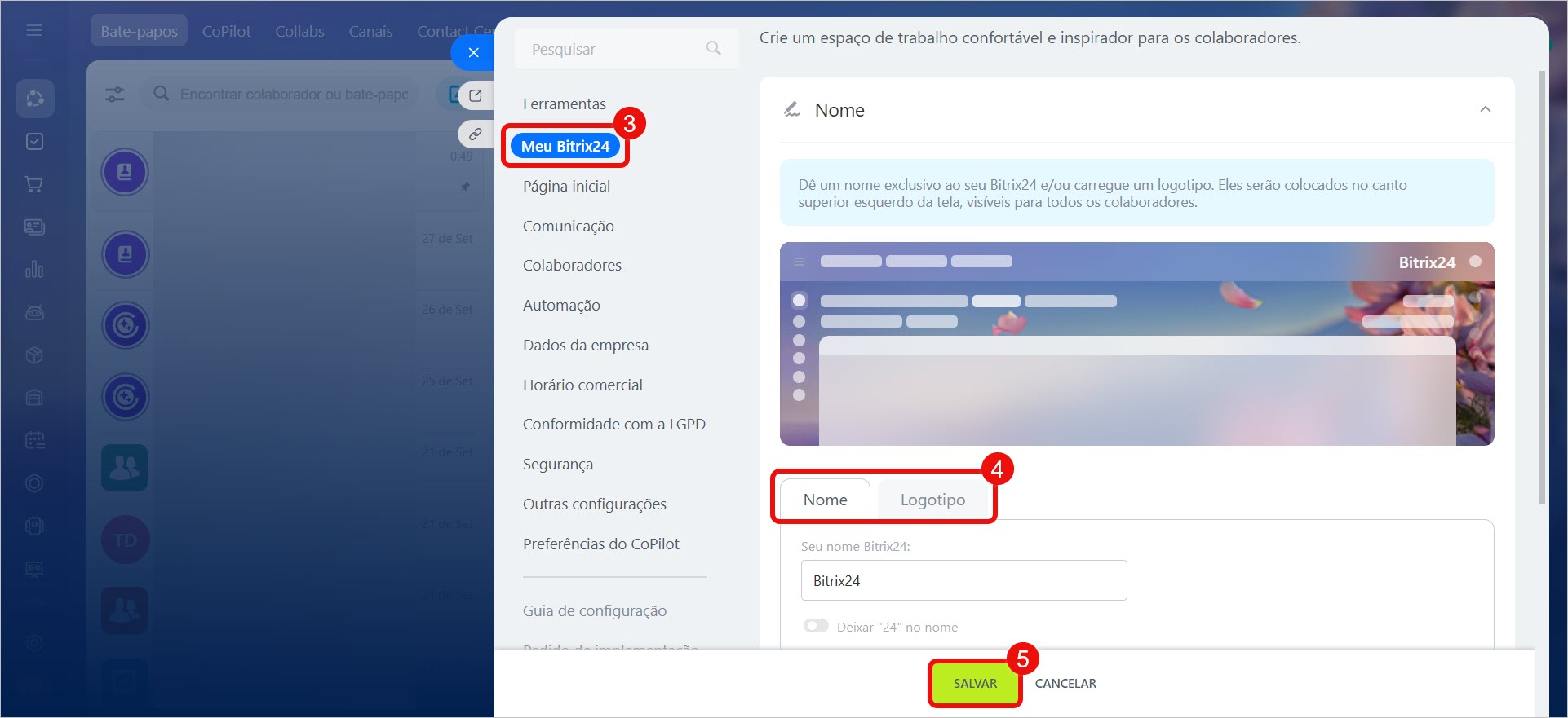 ao lado do nome do Bitrix24. - No menu que será aberto, clique em Configurações.