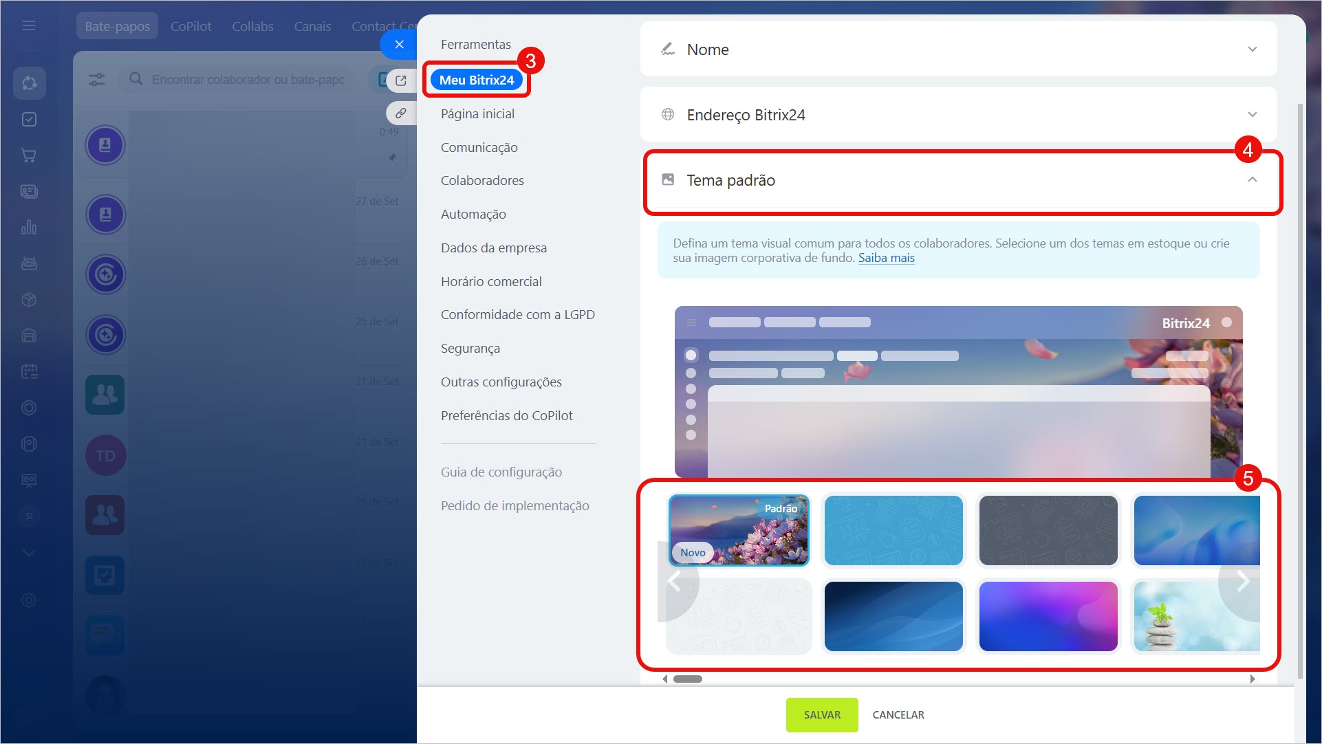 3. Escolha um tema pronto ou crie o seu próprio. Ele será aplicado para todos os colaboradores da sua conta do Bitrix24.