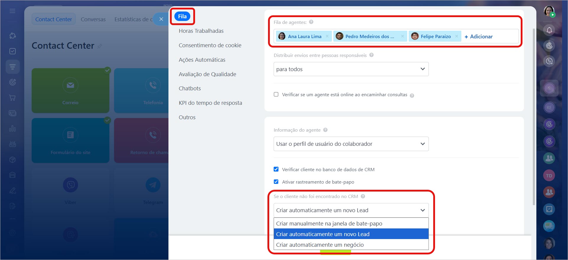 Na aba Fila, você pode definir os usuários que receberão as mensagens. Além disso, ajuste as configurações de criação de leads abaixo.