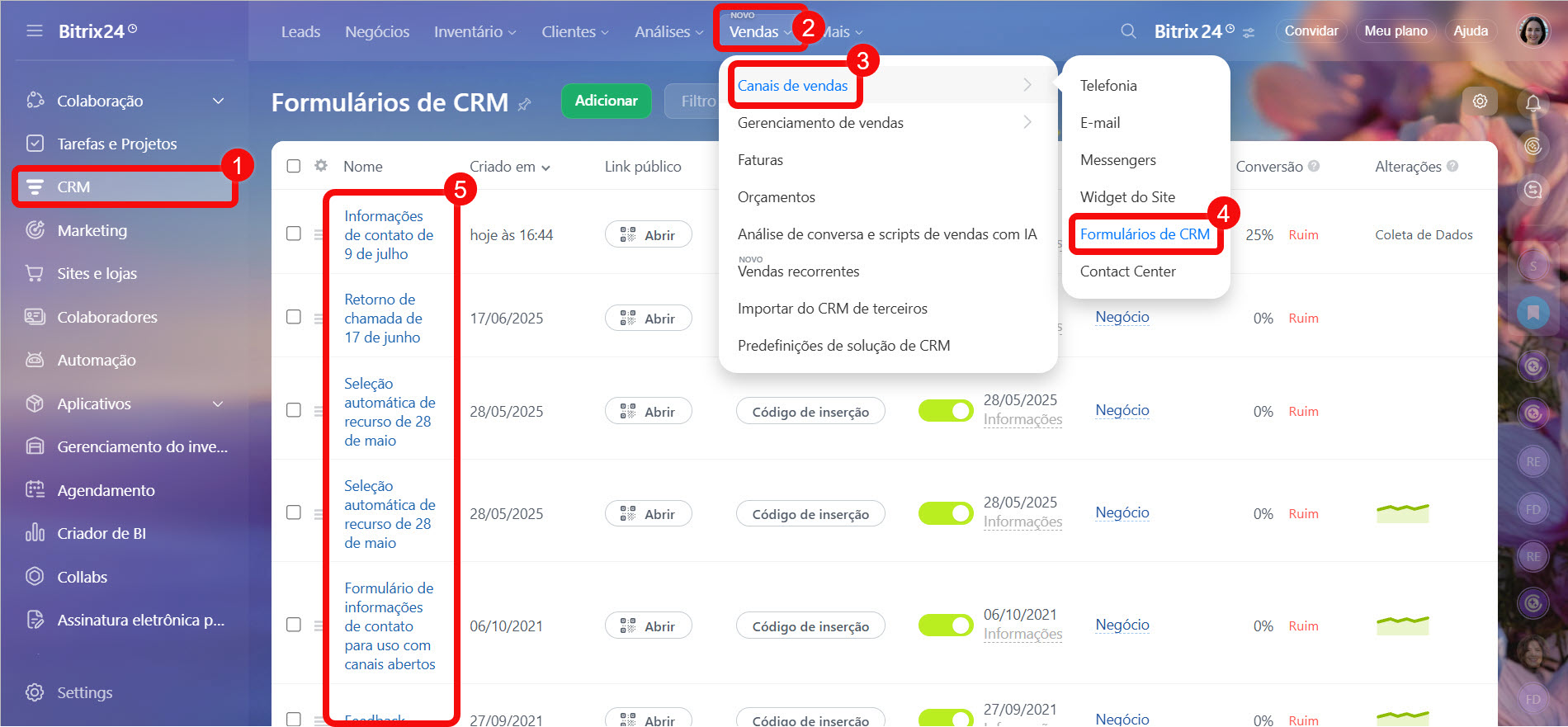 1-4. Acesse CRM > Vendas > Canais de vendas > Formulários de CRM.