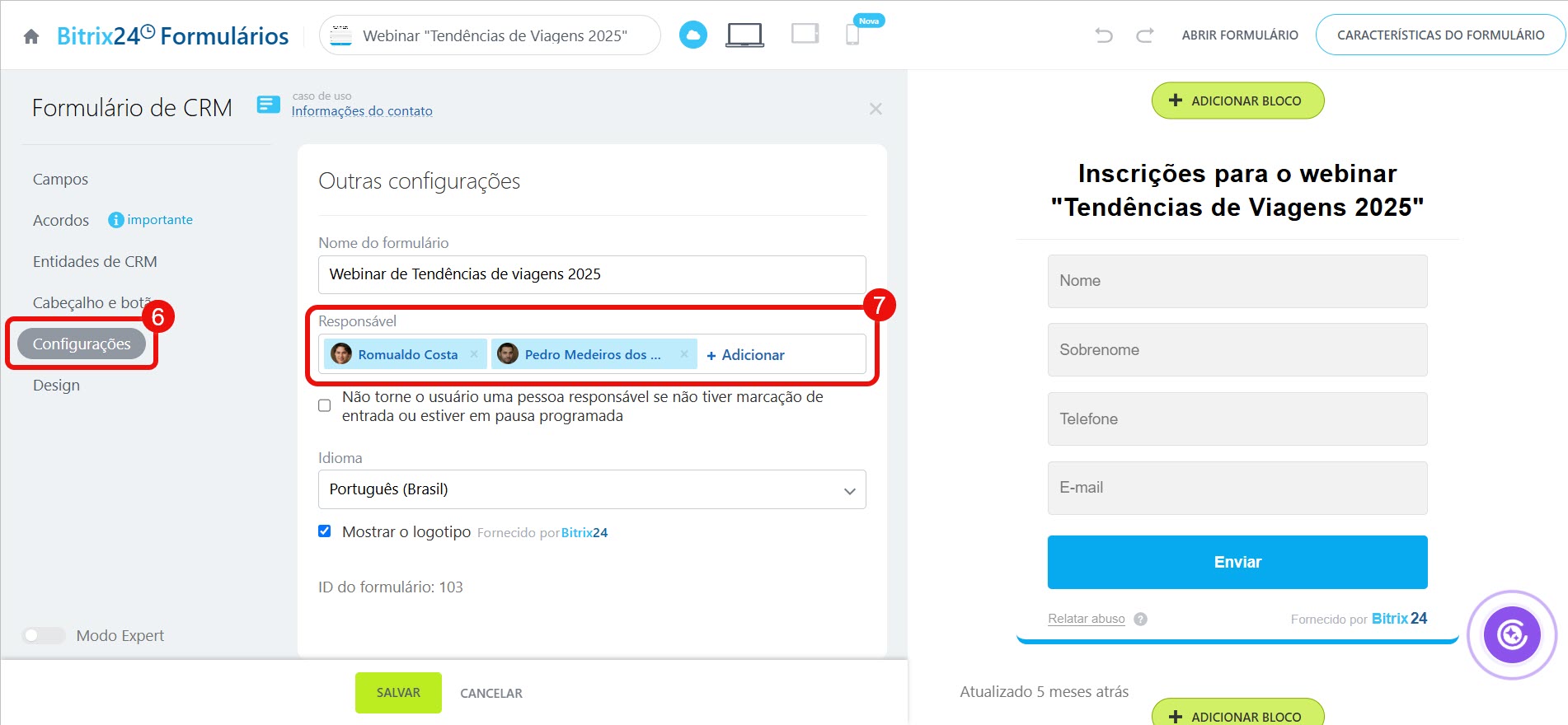 Para atribuir um responsável por um formulário de CRM: