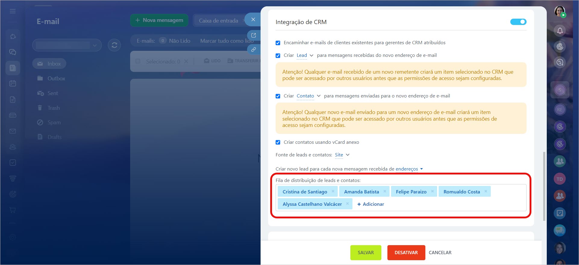 4. Adicione os usuários que trabalharão com novos leads no campo Fila de distribuição de leads e contatos.