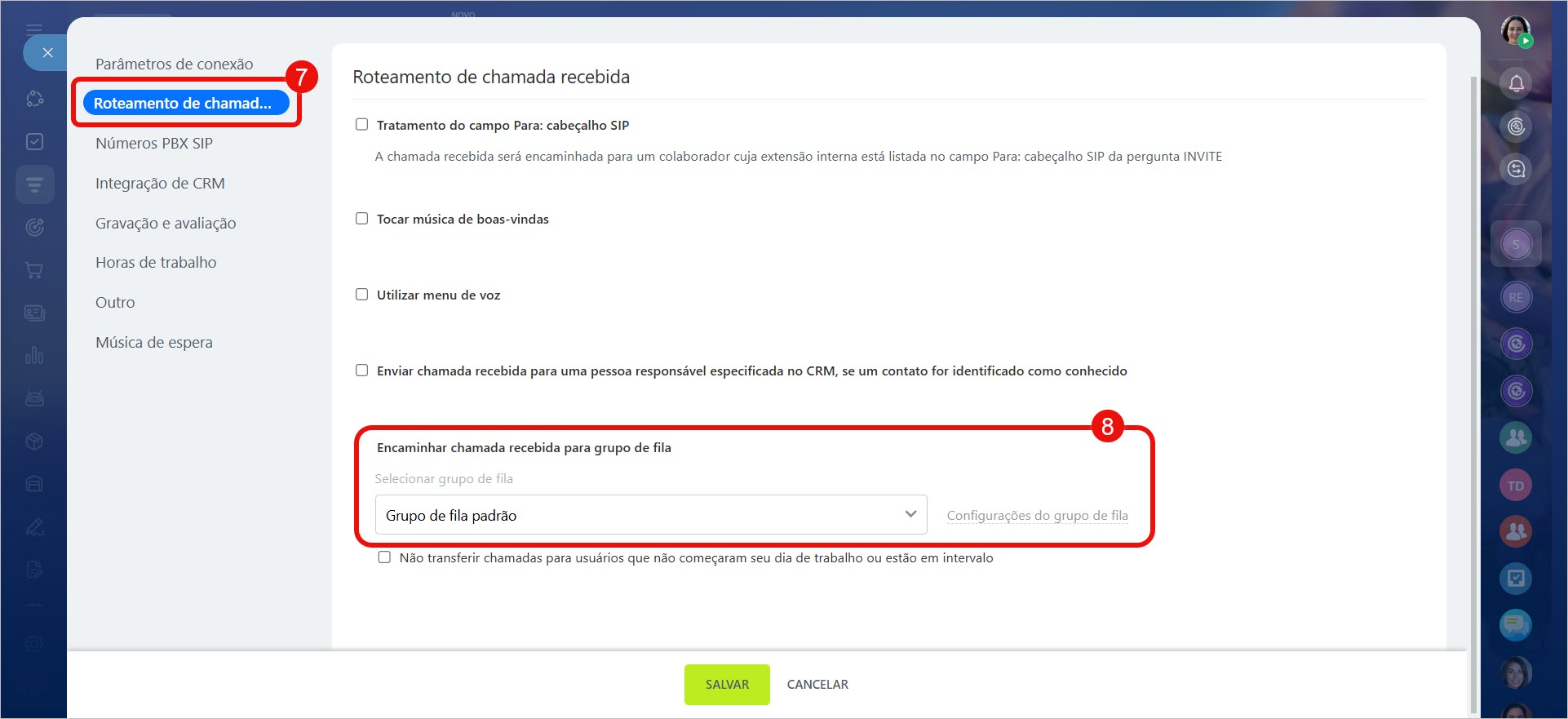 7-8. Na aba Roteamento de chamada recebida, selecione um grupo de usuários da telefonia e clique em Configurações do grupo de fila.